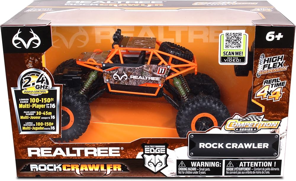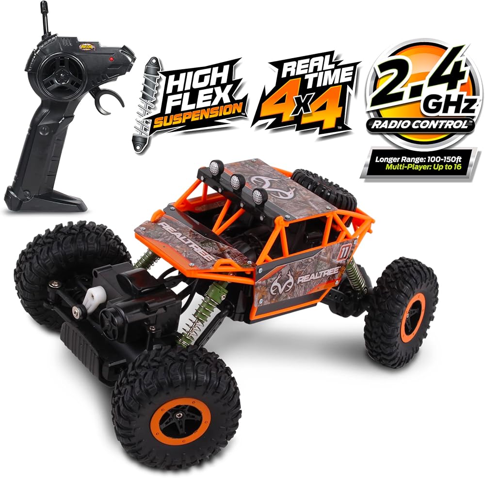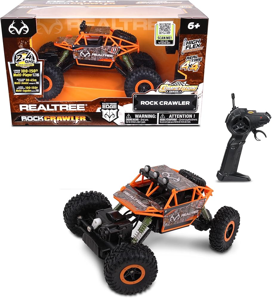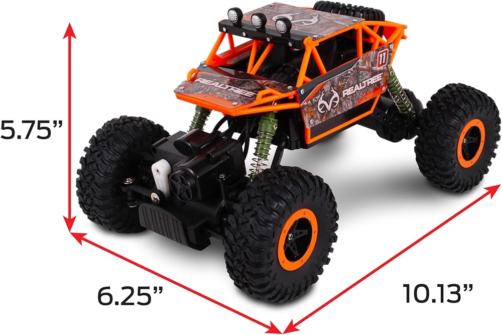 Get your climb on with the RealTree's 1:16 scale, radio controlled, full function rock crawler! Its superior level of performance & innovative suspension system allows for unparalleled rock crawling adventures. Driven by an incredibly powerful motor and insanely grippy tires, the ratio of chassis to super rugged body make this rock crawler ready to tackle even the toughest climbs! That pistol grip controller is ergonomic and it uses a 2.4 GHz frequency that allows 16 players to race at the same time, with a massive range of up to 150 feet. It has real time 4x4 power and some high flex suspension.
