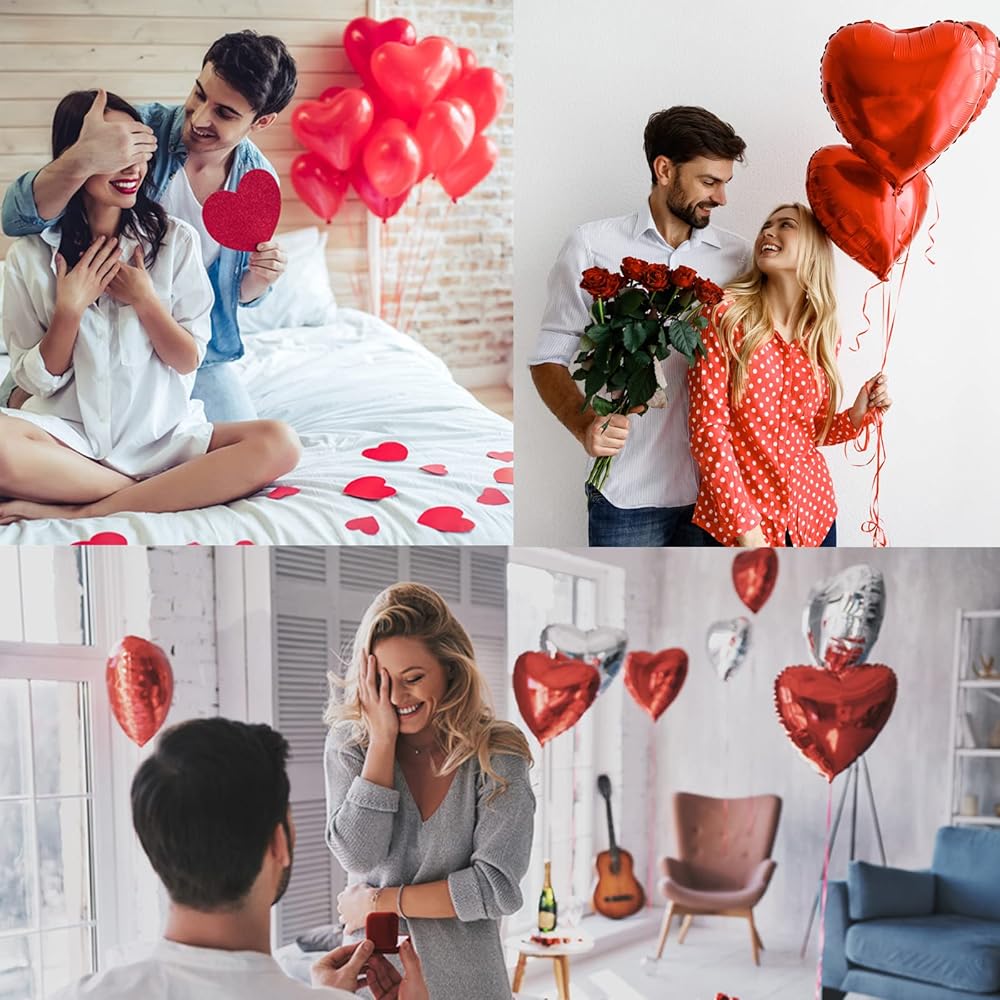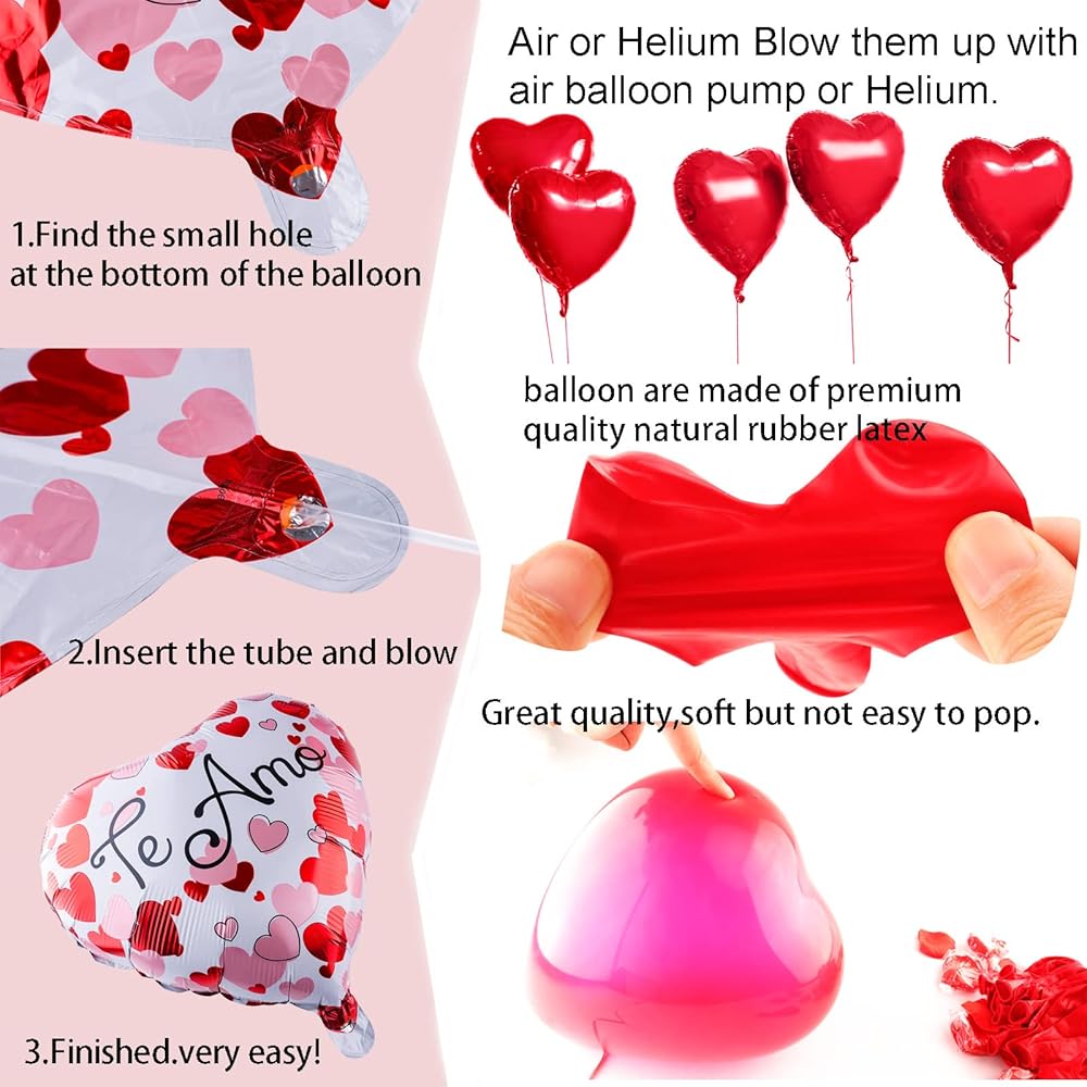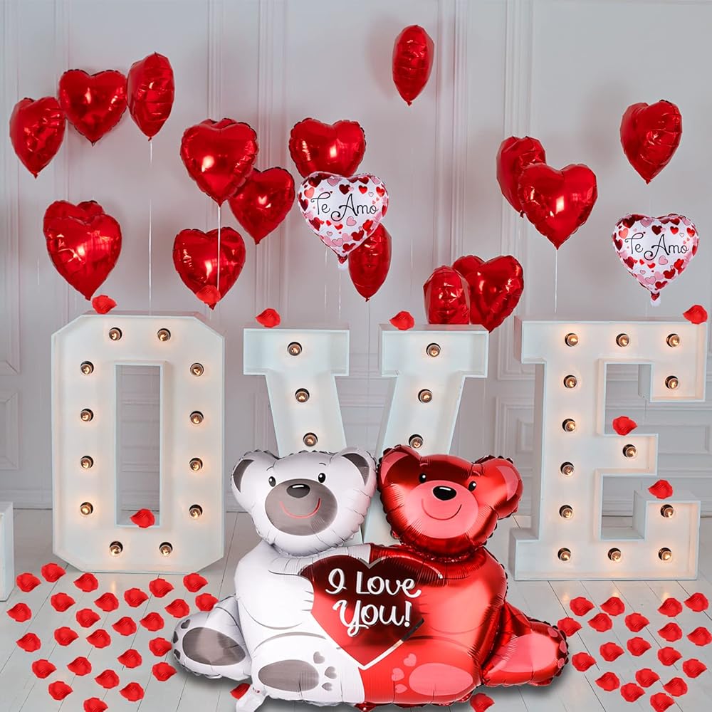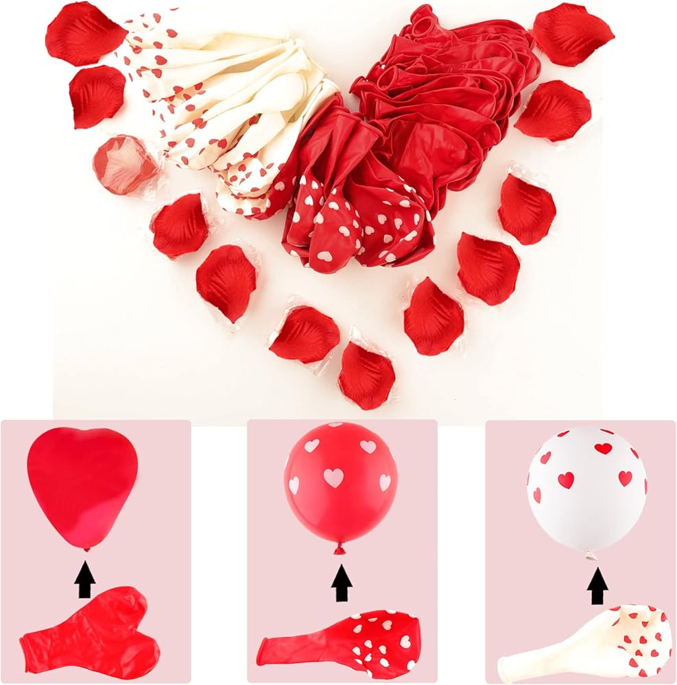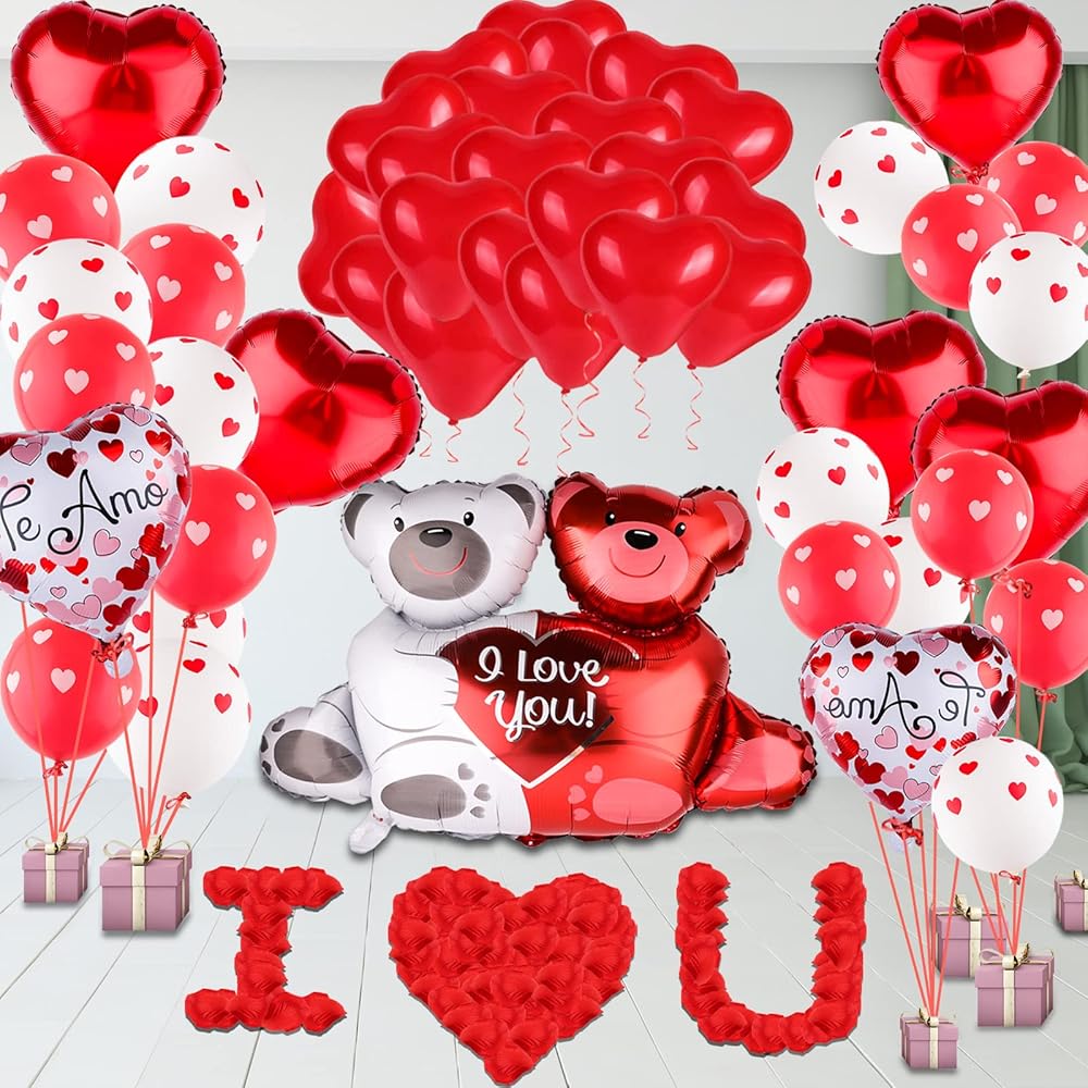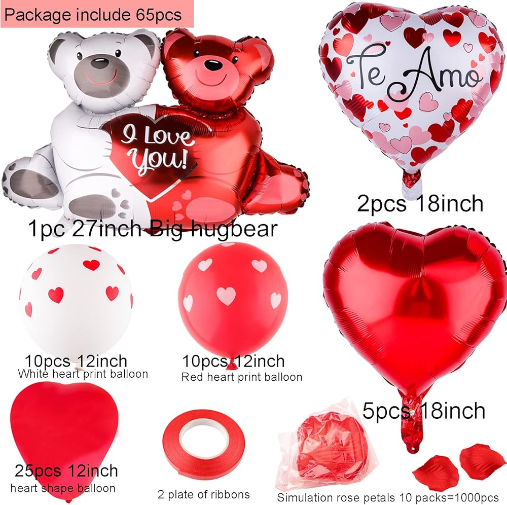 • تتضمن العبوة: بالون من الفويل على شكل دب حب مقاس 68.58 سم (قطعة واحدة)، 1000 قطعة من بتلات الزهور الصناعية، شريط 2، بالونات لاتكس مطبوعة على شكل قلب أحمر 30.48 سم (10 قطع) بالونات لاتكس مطبوعة على شكل قلب أبيض (10 قطع) مقاس 45.72 سم (5 قطع)، 30.48 سم من اللاتكس على شكل قلب أحمر بالونات (25 بالون قطعة)، بالونات على شكل قلب 45.72 سم مع "لاف يو"