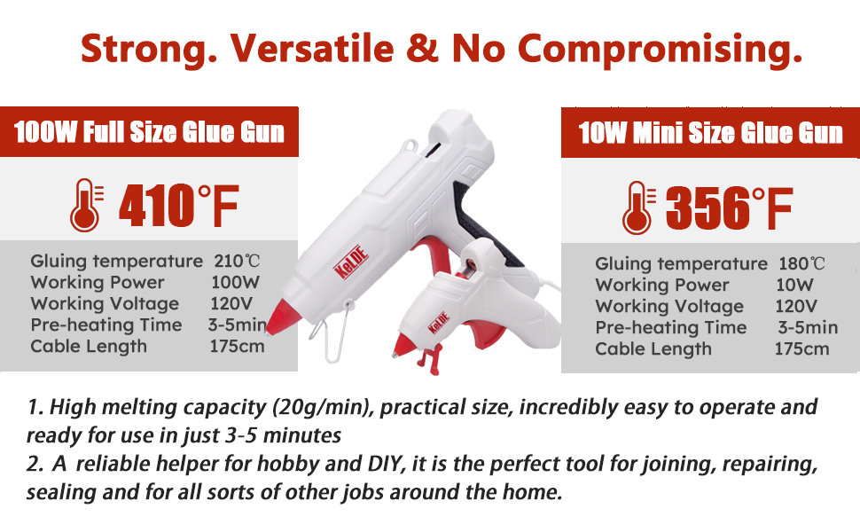 【اختيار مختلف للطاقة واستخدام واسع】مع 100 واط من طاقة التسخين، فإن مسدس الغراء الساخن بالحجم الكامل قوي بما يكفي لإذابة جميع أنواع أعواد الصمغ كاملة الحجم ويمكن استخدامه لربط السيراميك والزجاج والخشب والمواد الأخرى؛ الحجم الصغير لمسدس الغراء بقدرة 10 وات، الحجم الصغير يجعله مثاليًا للأعمال التفصيلية مثل الديكور والزخارف خفيفة الوزن للمواد الحساسة مثل الورق والنسيج والمزيد. يمكنك أيضًا استخدام هذين المسدسين الغراء لخلق مواهب مع أطفالك وقضاء الوقت معًا.