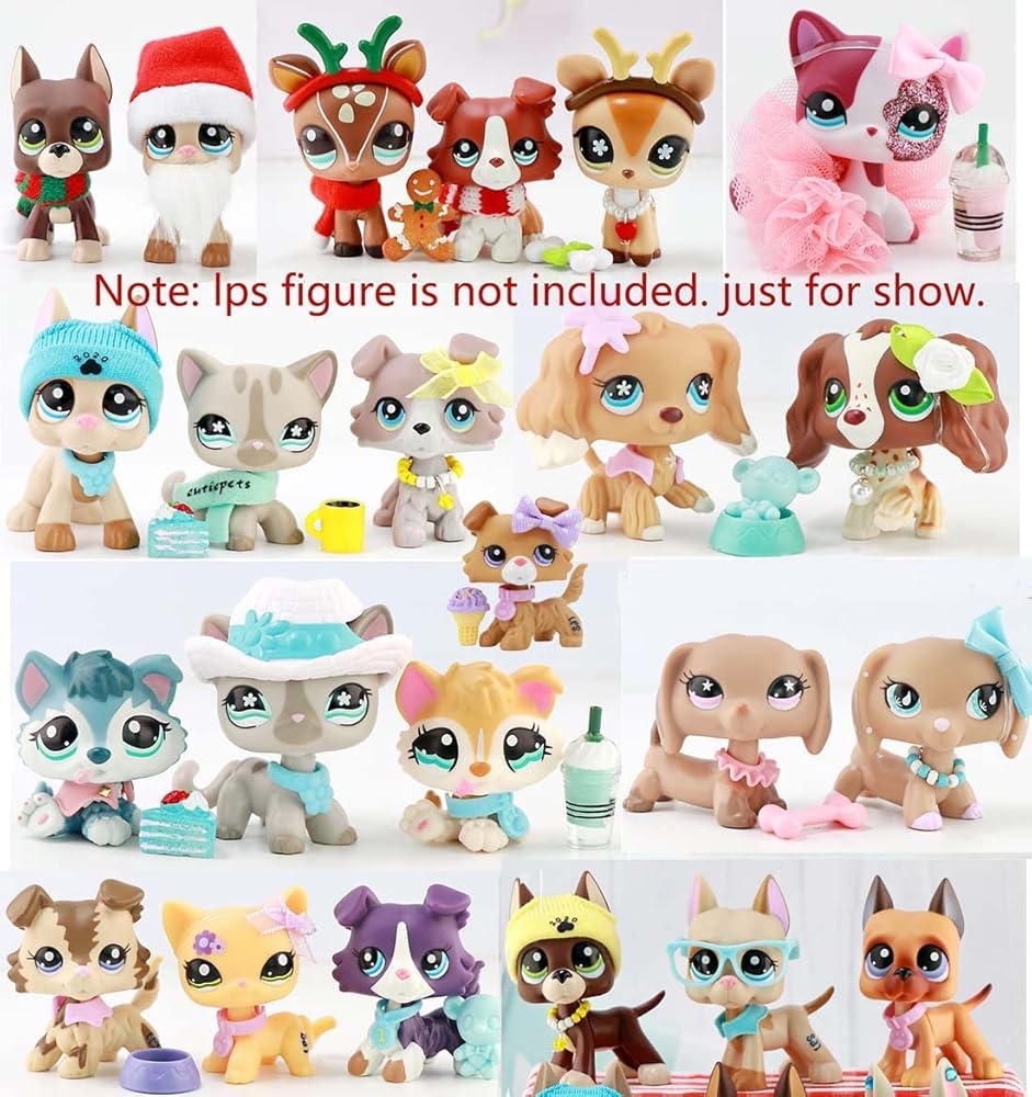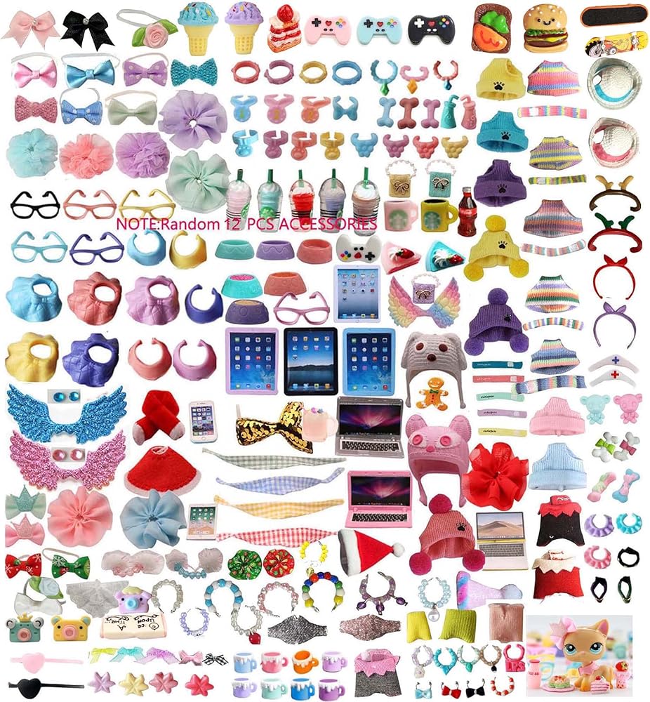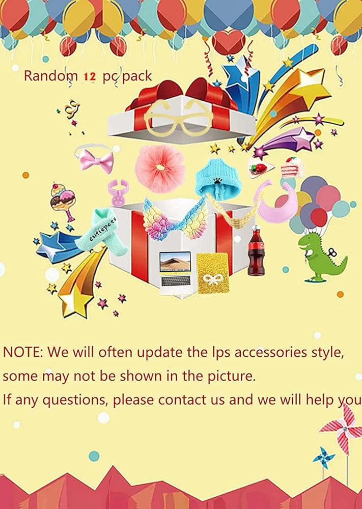 مجموعة ملحقات LPS (12 قطعة عشوائية) قبعة كمبيوتر محمول، نظارات وأجنحة، ملابس، ياقة تنورة، ياقة للطعام والشراب، تناسب LPS Shorthair Cat and Collie Dachshund Cocker Spaniel Husky Puppy Dog LPS Deer الشكل