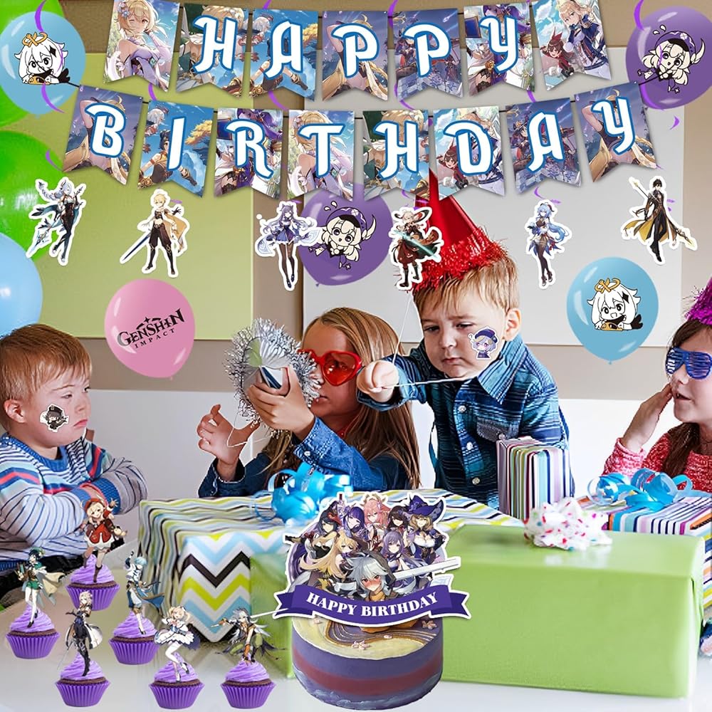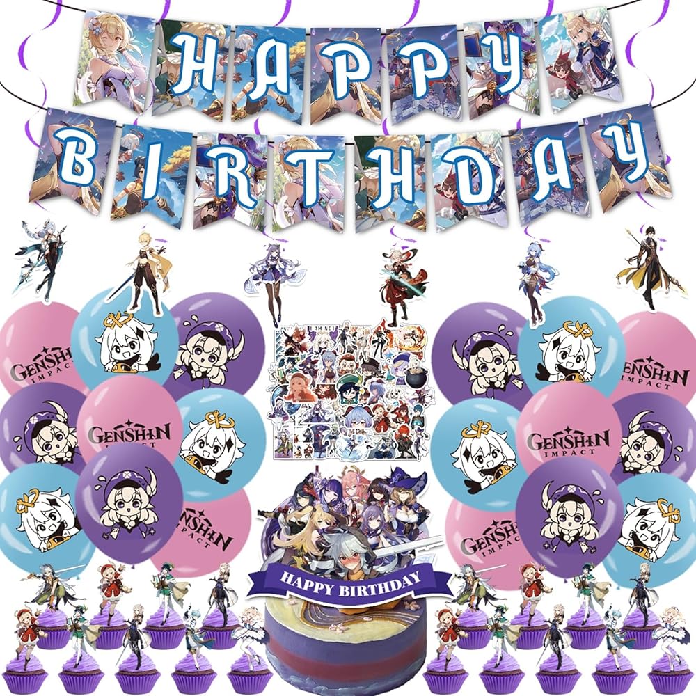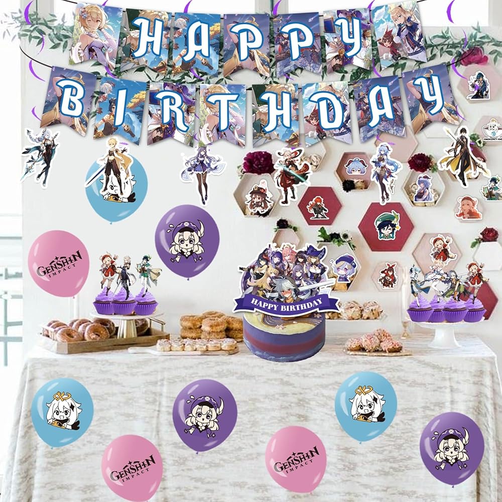 لوازم حفلات جينشين إمباكت، 106 قطعة من ديكورات حفلات جينشين إمباكت تتضمن لافتة عيد ميلاد، وغطاء للكيك، وغطاء للكب كيك، ودوامة معلقة، وبالون لاتكس وملصق