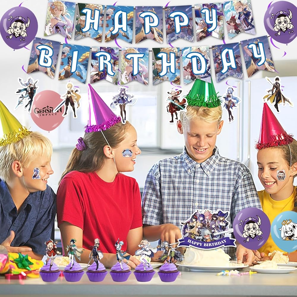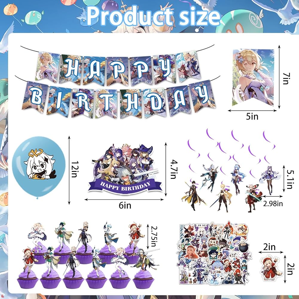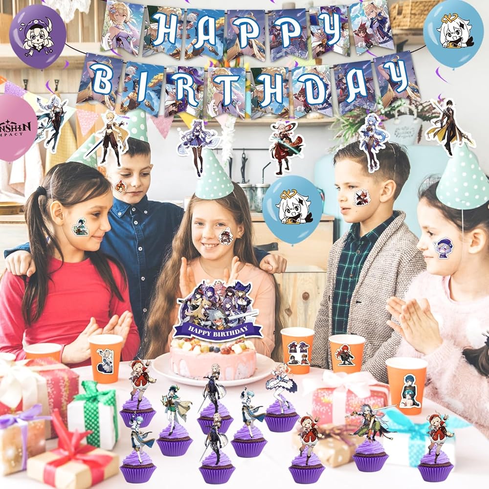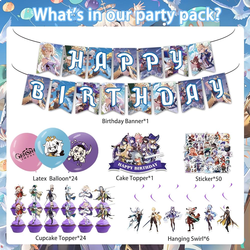 لوازم حفلات جينشين إمباكت، 106 قطعة من ديكورات حفلات جينشين إمباكت تتضمن لافتة عيد ميلاد، وغطاء للكيك، وغطاء للكب كيك، ودوامة معلقة، وبالون لاتكس وملصق