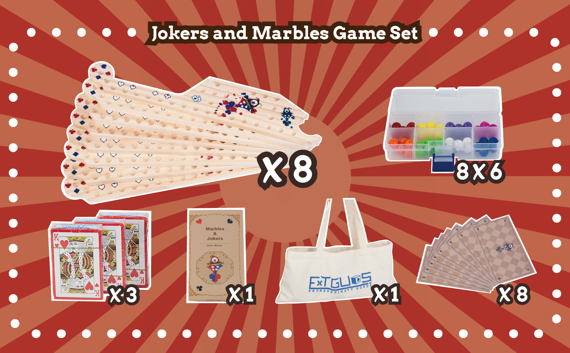 🤡【الرخام والجوكر】تتضمن 8 ألواح خشبية + 48 كرة رخام ملونة (واحدة احتياطية من كل لون) + 3 مجموعات من بطاقات اللعب + 8 بطاقات قواعد PVC + 1 صندوق تخزين رخامي + 1 حقيبة قماش + 1 دليل ألعاب