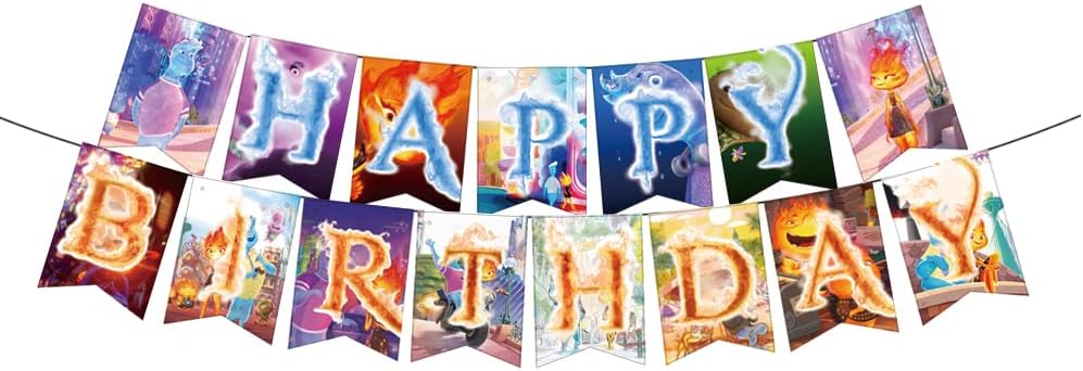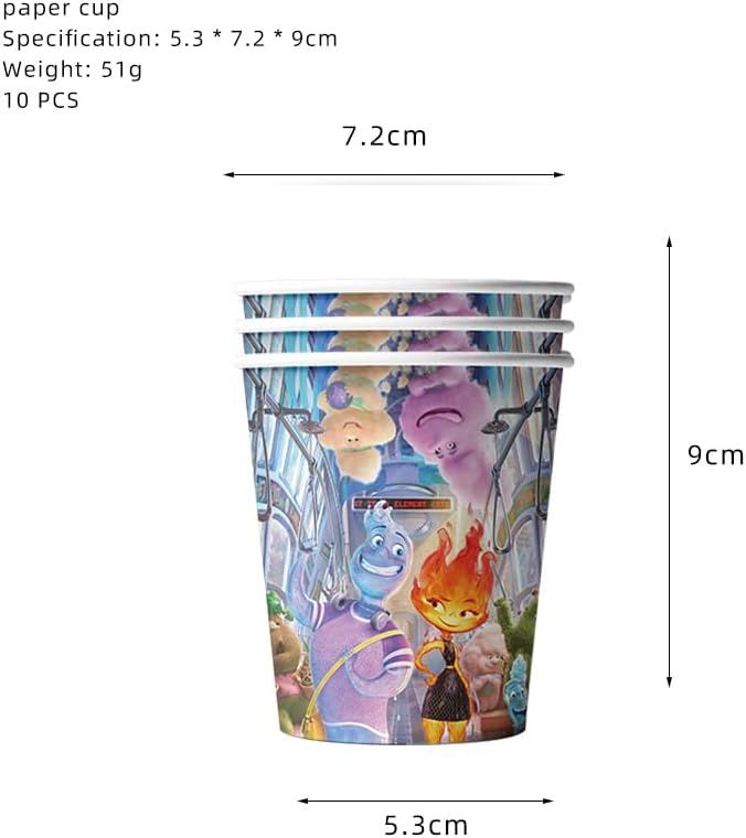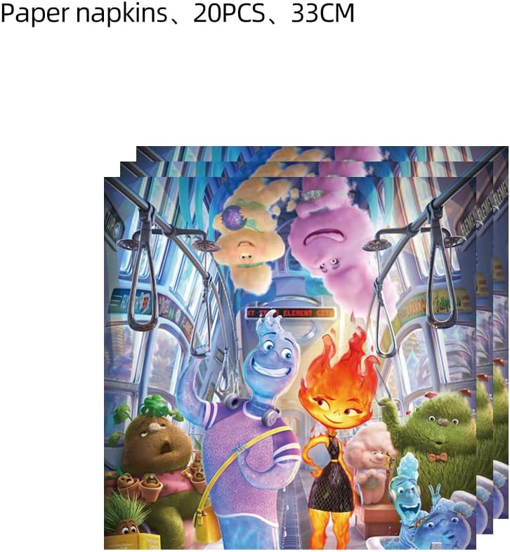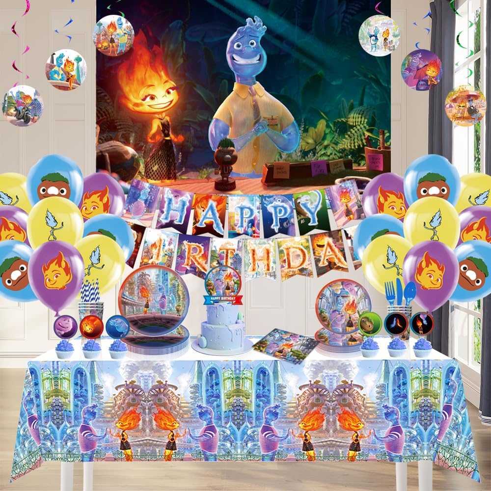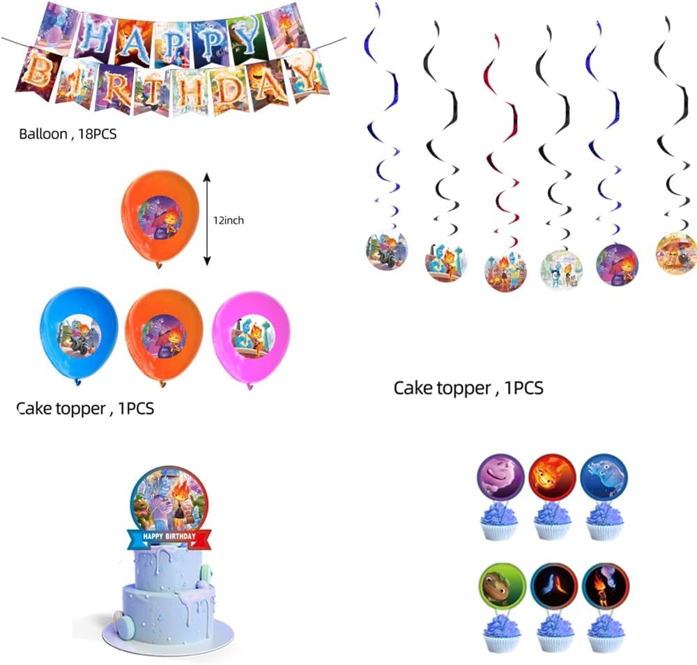 • 【132 Pieces Crazy Elemental City Party Decorations】: Crazy Elemental City supplies include 1 banner, 1 backdrop, 6 hanging swirls, 1 tablecloth, 10 9-inch plates, 10 knives, 10 forks, 10 spoons , 18 Blow Up Balloons, 1 Cake Topper, 24 Cupcake Toppers, 10 Straws, 10 Cups, 20 Napkins,