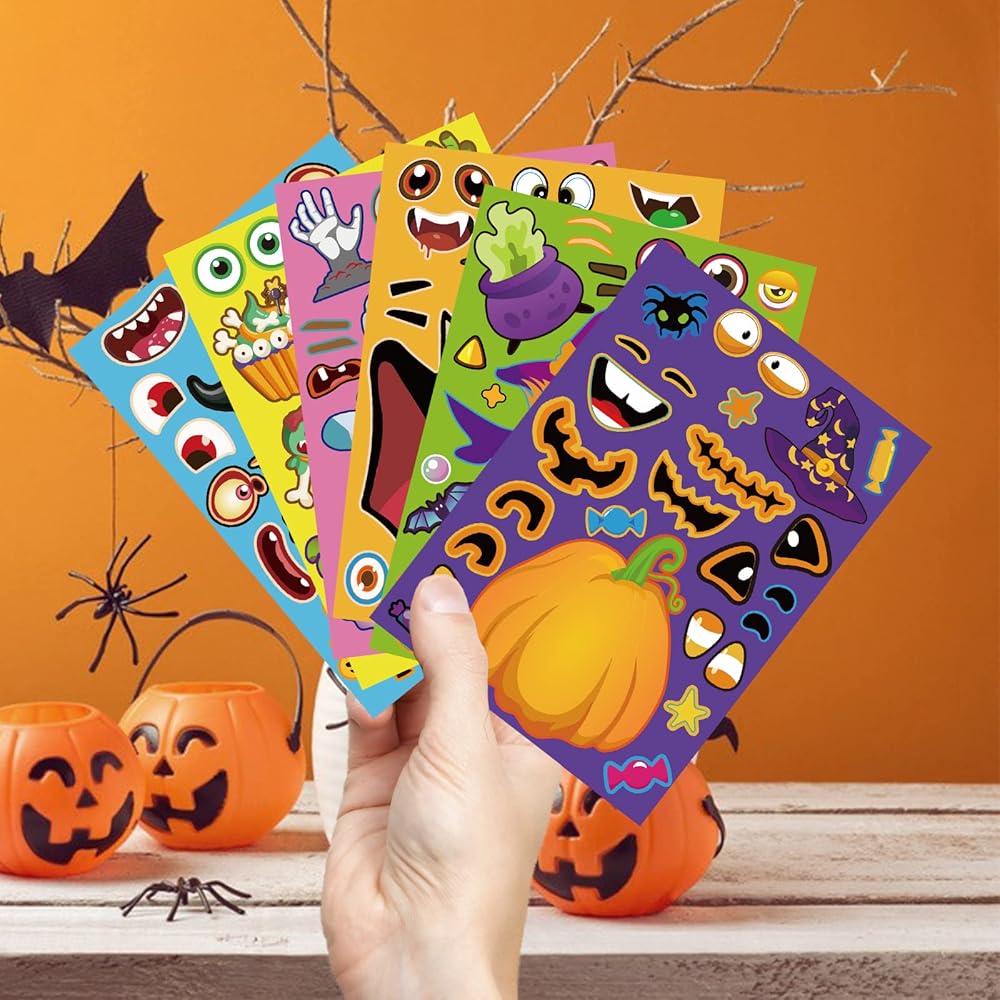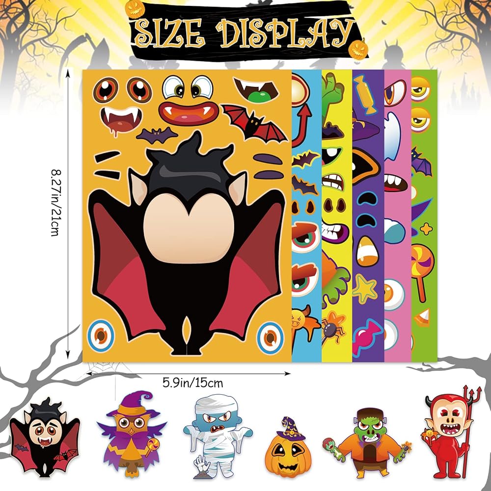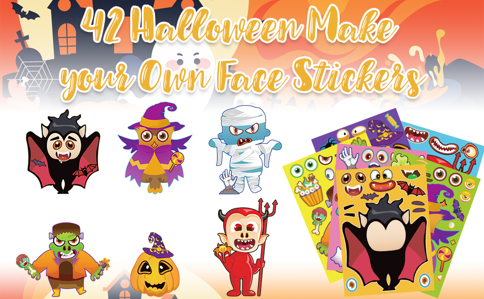 ✔️【VALUABLE PACK】42 sheets of Halloween make face stickers to let kids create jack-o'-lantern, vampire, demon, witch, mummy, and Minotaur stickers all their own, 6 styles in one set, each has 7 sheets, great Halloween party games for kids to play