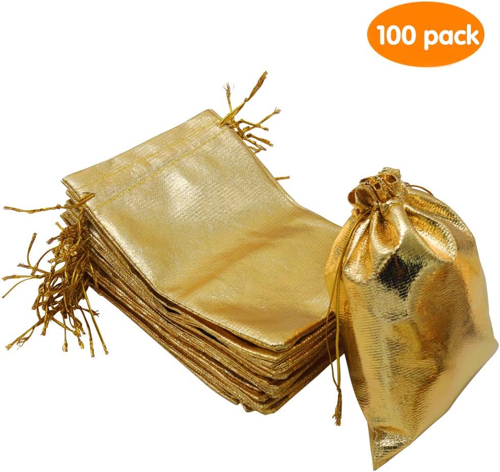 100 قطعة من حقائب الهدايا الذهبية برباط سحب (تأتي في أكياس تخزين بسحاب قابلة لإعادة الاستخدام)