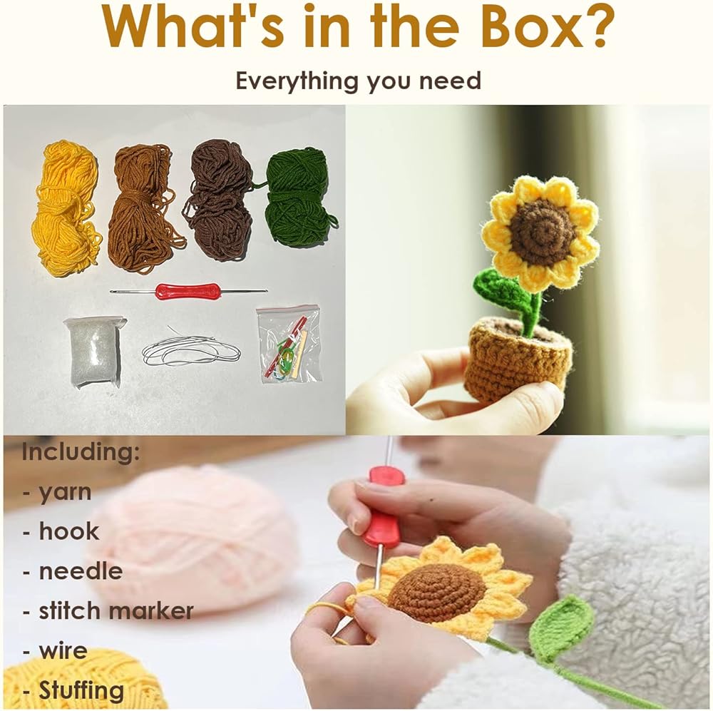 • Crochet Kit for Beginners - Kitcroet sunflower potted plants crochet kit contains everything you need to get started, including yarns, crochet hook, stuffing, needle, marker buckle, iron wire, and step-by-step video tutorial. A complete starter crochet kit to make 2 sunflower potted plants.