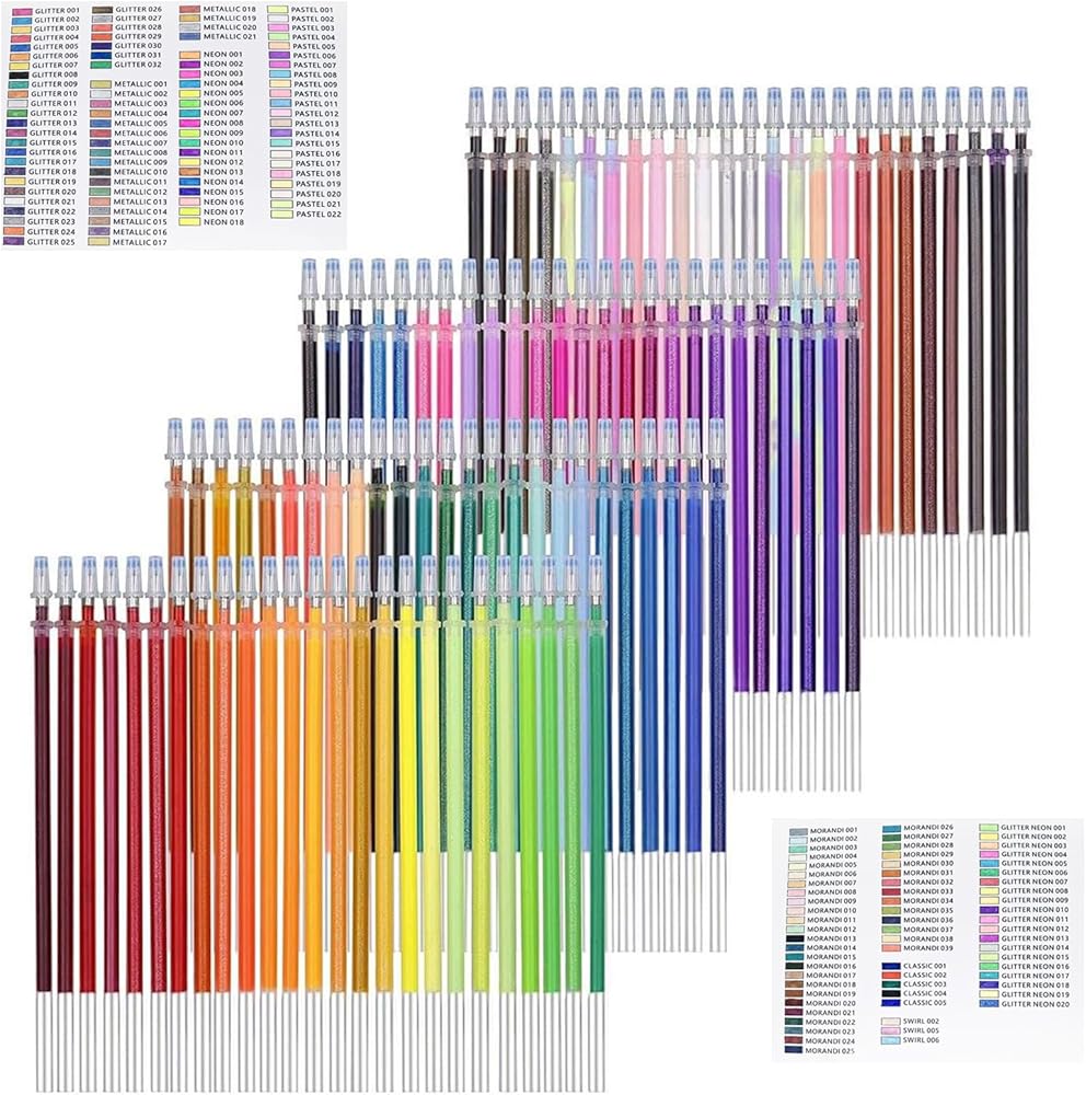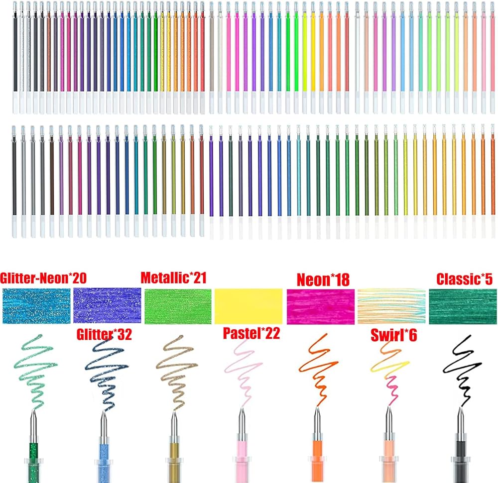 مجموعة متنوعة من الأشكال: تحتوي مجموعة أقلام الجل الملونة المكونة من 160 لونًا على العديد من أنواع الألوان، بما في ذلك 32 جليتر، 21 معدني، 22 باستيل، 18 فلورسنت، 39 موراندي، 20 فلورسنت لامع، 5 كلاسيكي، 3 ألوان مختلطة. ألوان غنية لتلبية جميع احتياجاتك من الألوان.