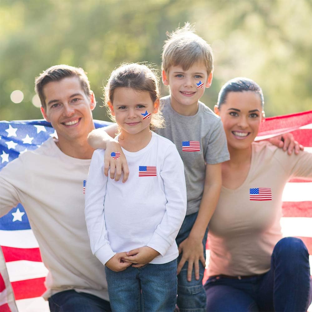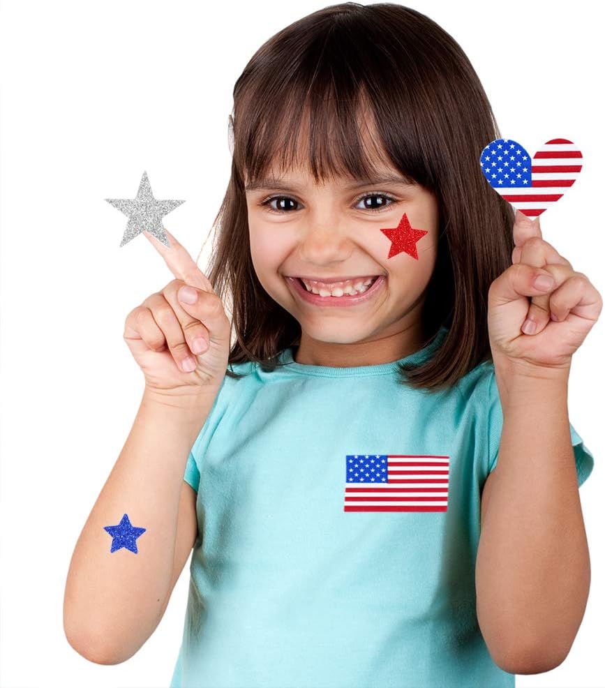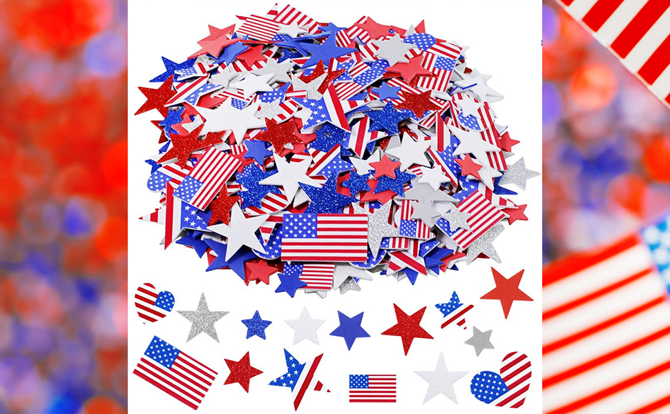 تحتوي العبوة على 8 أوراق (392 قطعة) ملصقات إسفنجية وطنية على شكل نجمة باللون الأحمر اللامع، والأزرق، والفضي، والأبيض، والرمادي، و2 ورقتين (110 قطعة) ملصقات متنوعة بالعلم الأمريكي الوطني الأمريكي في 3 أشكال (علم مستطيل، نجمة، قلب). جميع الأنماط المدرجة في العبوة مصورة.