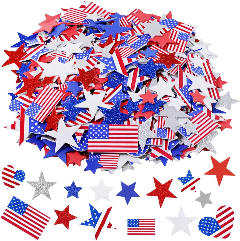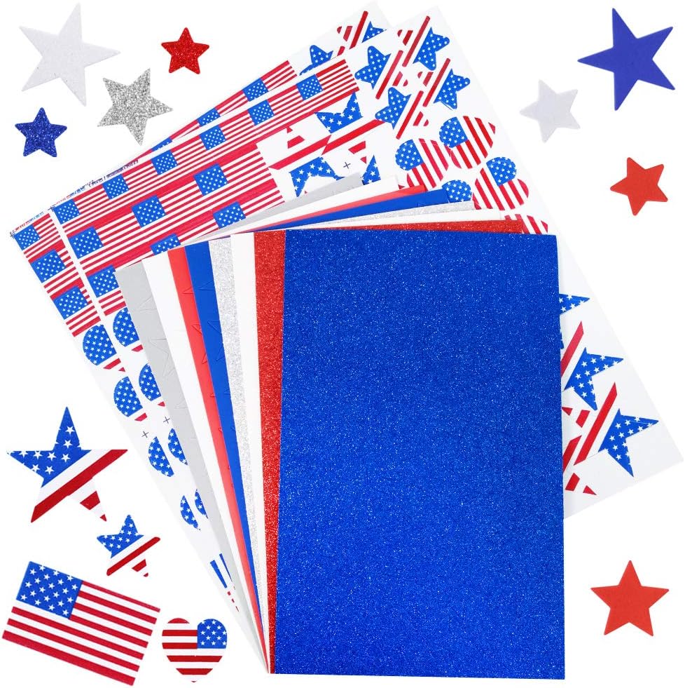 الكمية: تتضمن العبوة 8 ورقات (392 قطعة) ملصقات إسفنجية على شكل نجوم وطنية باللون الأحمر اللامع والأزرق والفضي والأبيض والرمادي ورقتان (110 قطعة)، متنوعة ملصقات من الفوم عليها العلم الأمريكي الوطني الأمريكي في 3 أشكال (علم مستطيل، نجمة، قلب). جميع الأشكال المتضمنة في العبوة مصورة.