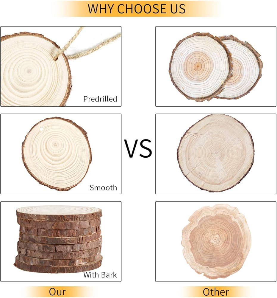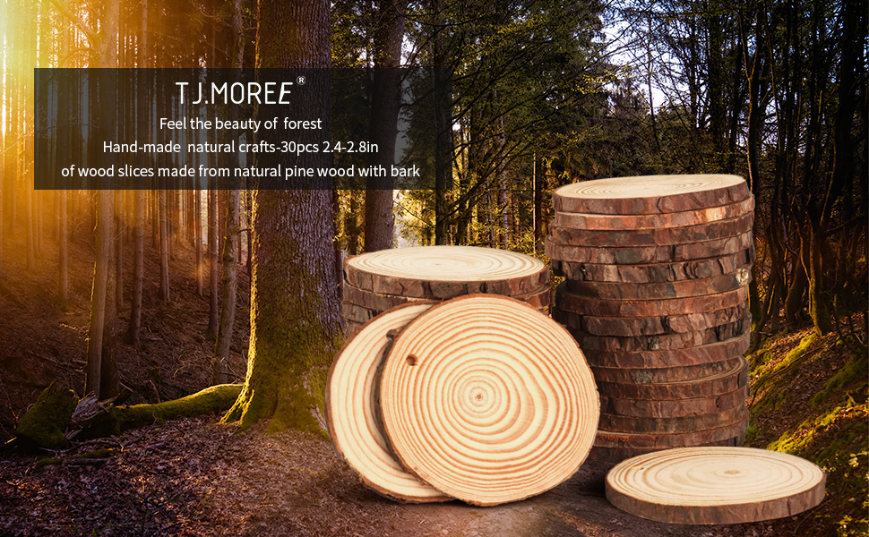 DIMENSIONS: These craft items are 2.4-2.8 inches in diameter and 0.2 inches thick. Set comes with 30 pcs. These wood slices are made of pure pine and include a small hole for easy hanging. Their perfect thickness will ensure that their durability.