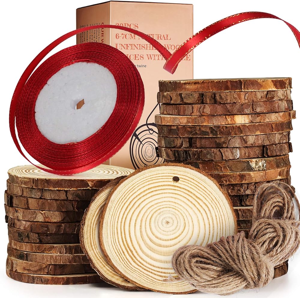 TJ.MOREE Wood Slices for Craft 30 Pcs 2.4-2.8 Inches, 25 Yard Christmas Ribbon,Great DIY Gift for Children Arts and Artistic Creation, 10yard Jute Rope, Wedding Centerpiece Decor,Christmas Ornaments