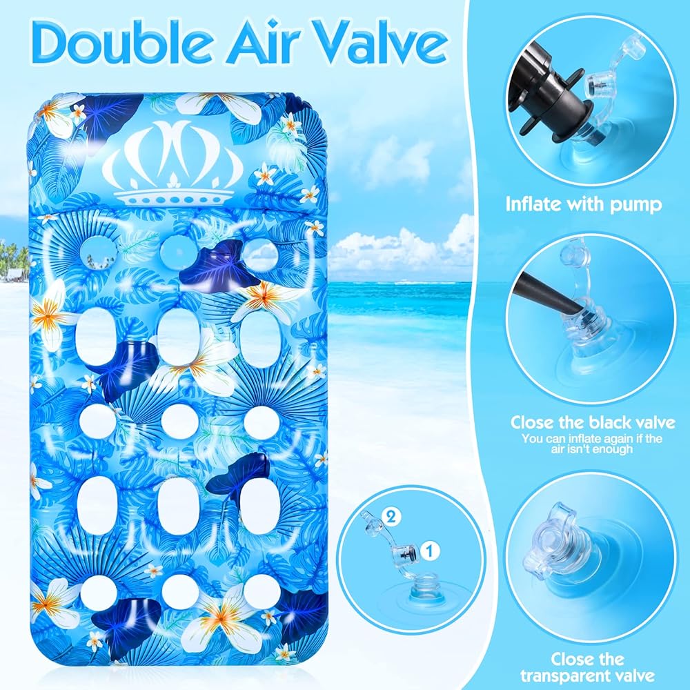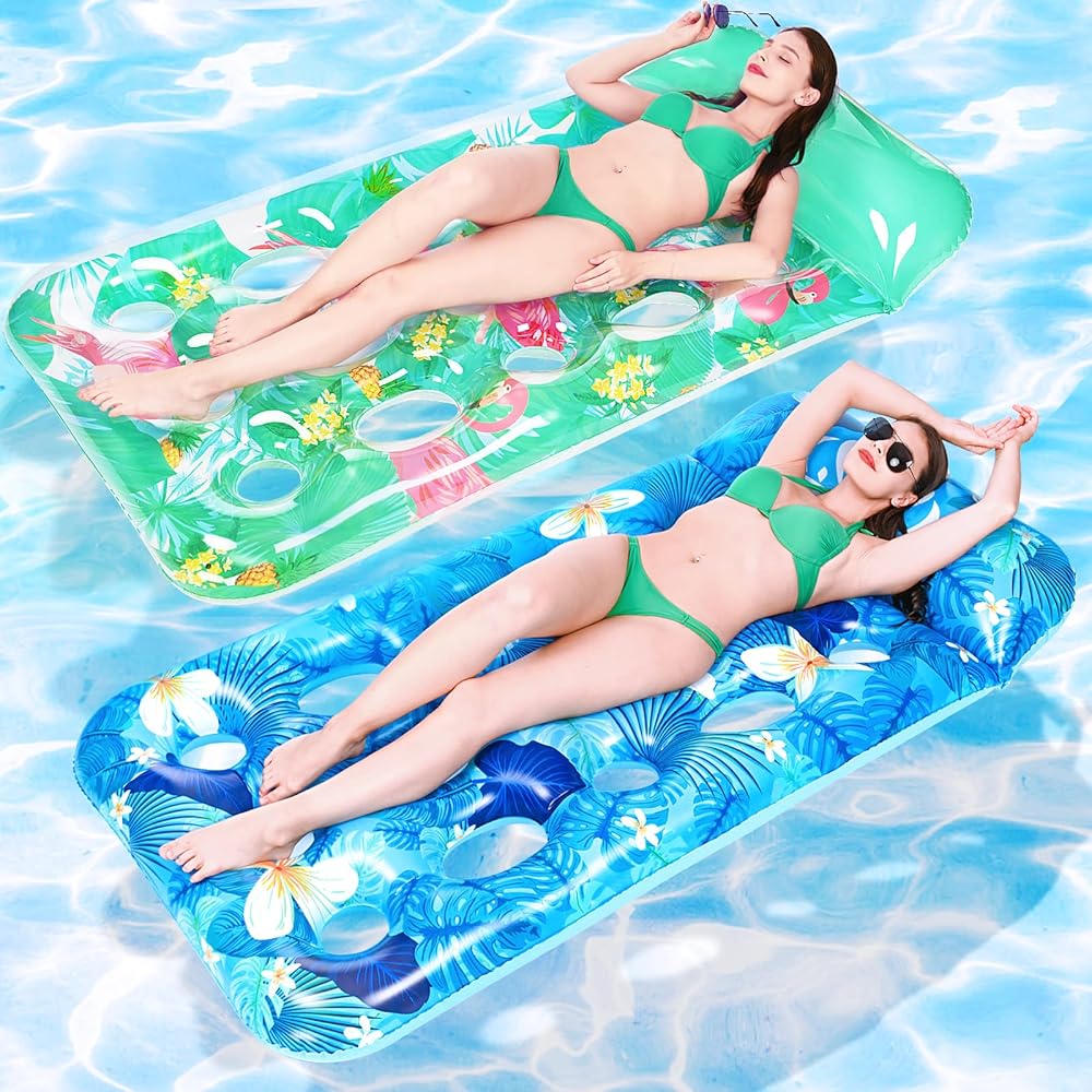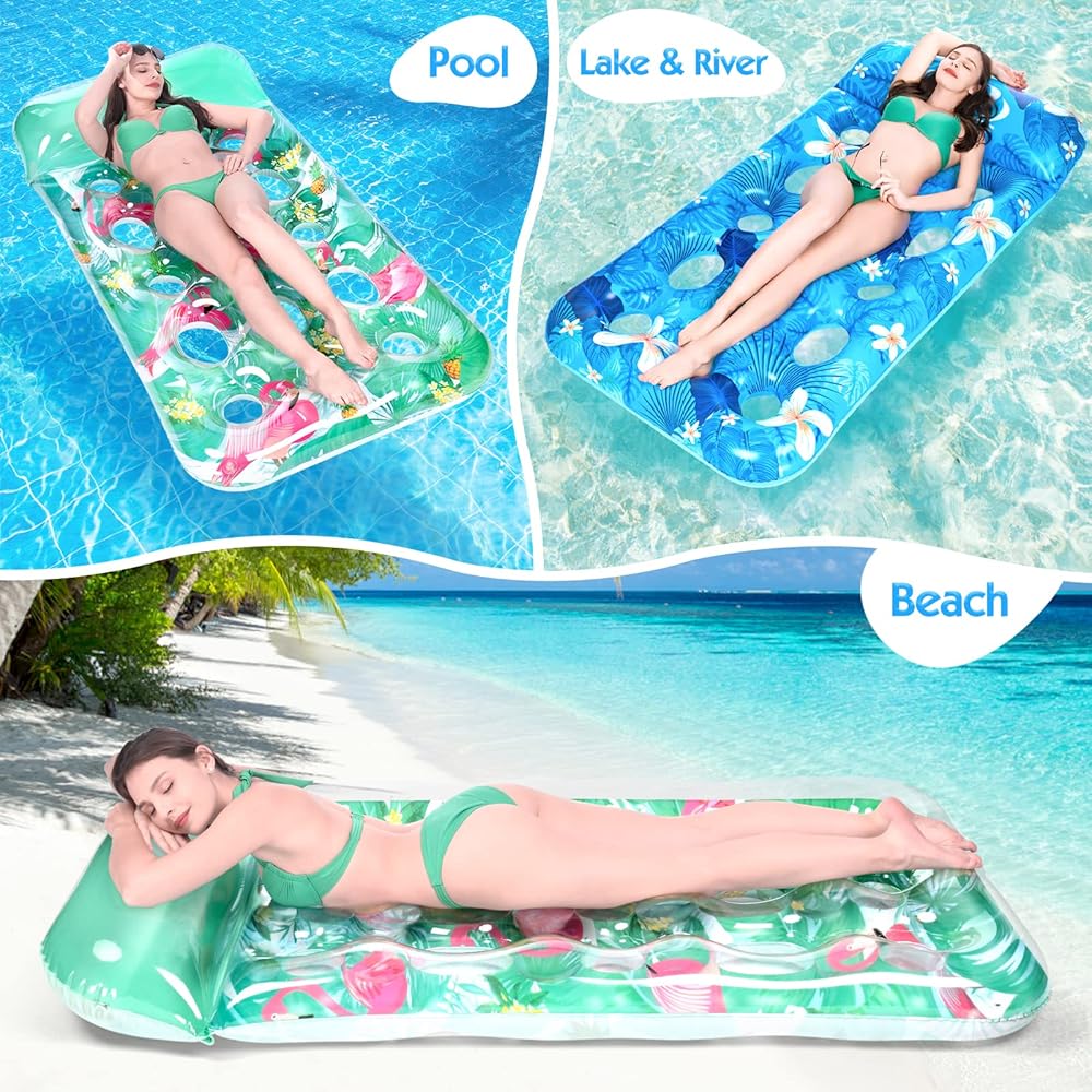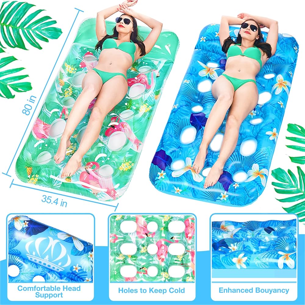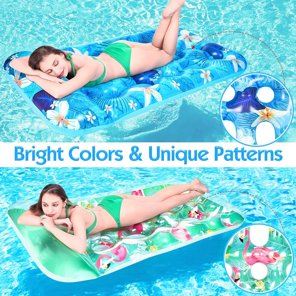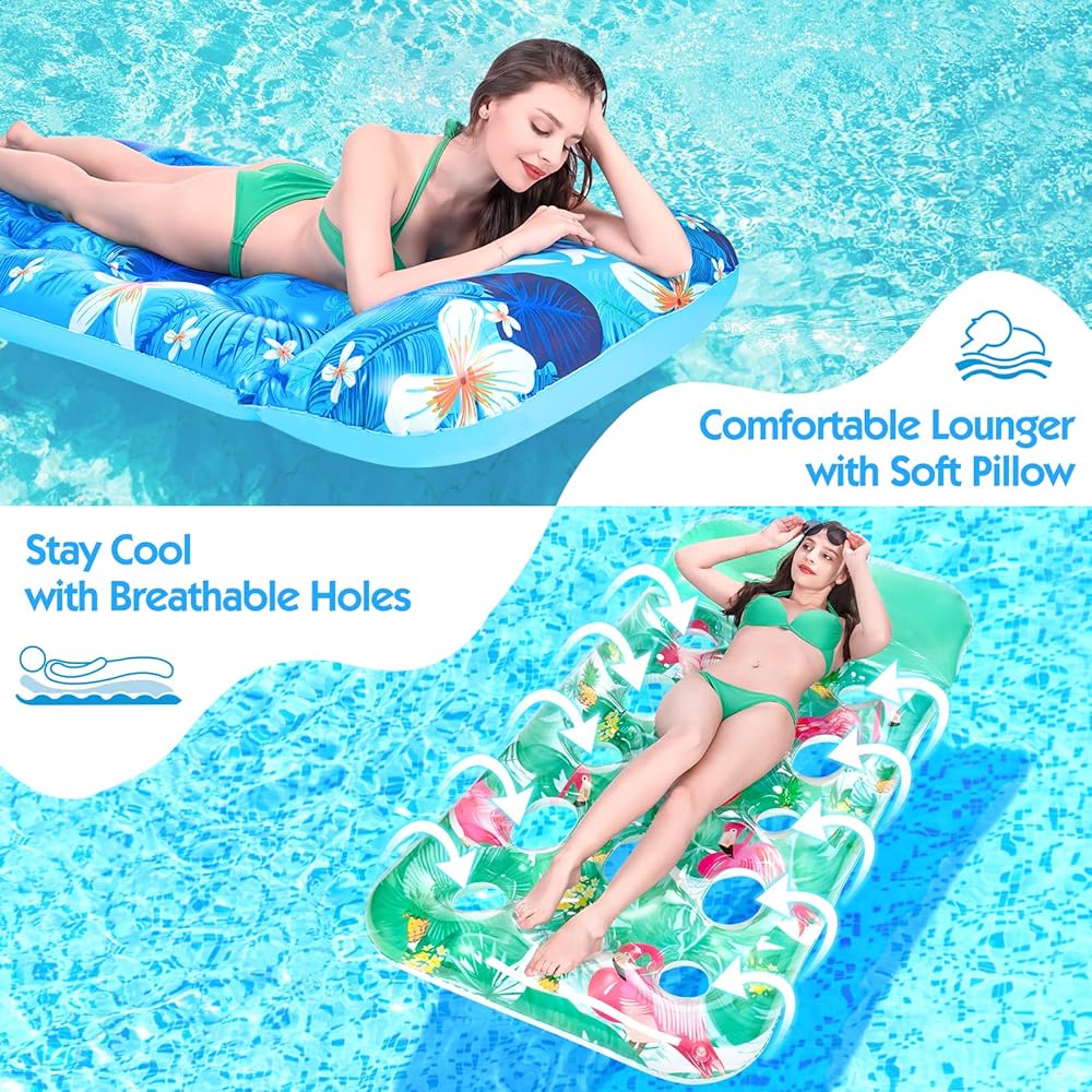【Comfortable & Unique Design】The soft pillow of the pool float lounge gives comfortable support to your head. The heat sink holes allow your body to touch water in moderation, keeping cool and breathable. At the same time, it also allows the inflatable pool floats to have more buoyancy and not easy to tip over. With bright colors and unique summer style patterns, these plus size pool floats are very eye-catching in the pool, bringing you a pleasant mood in hot days.