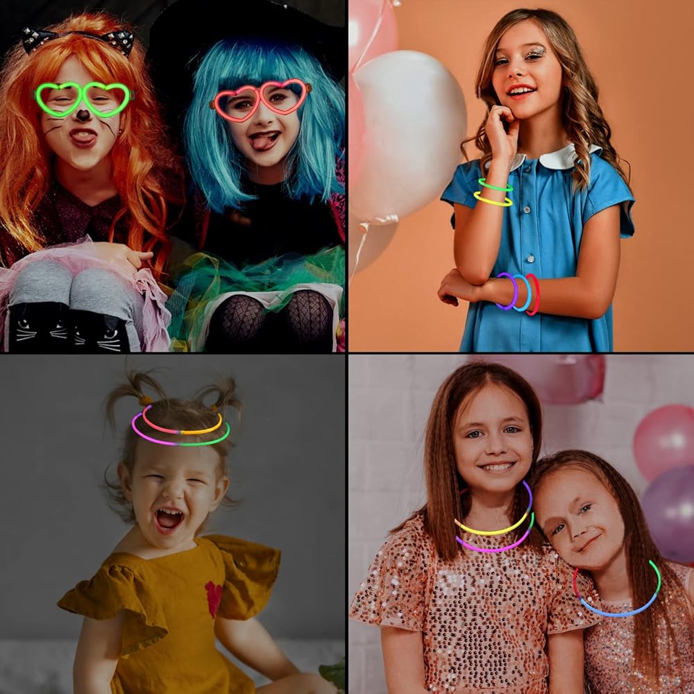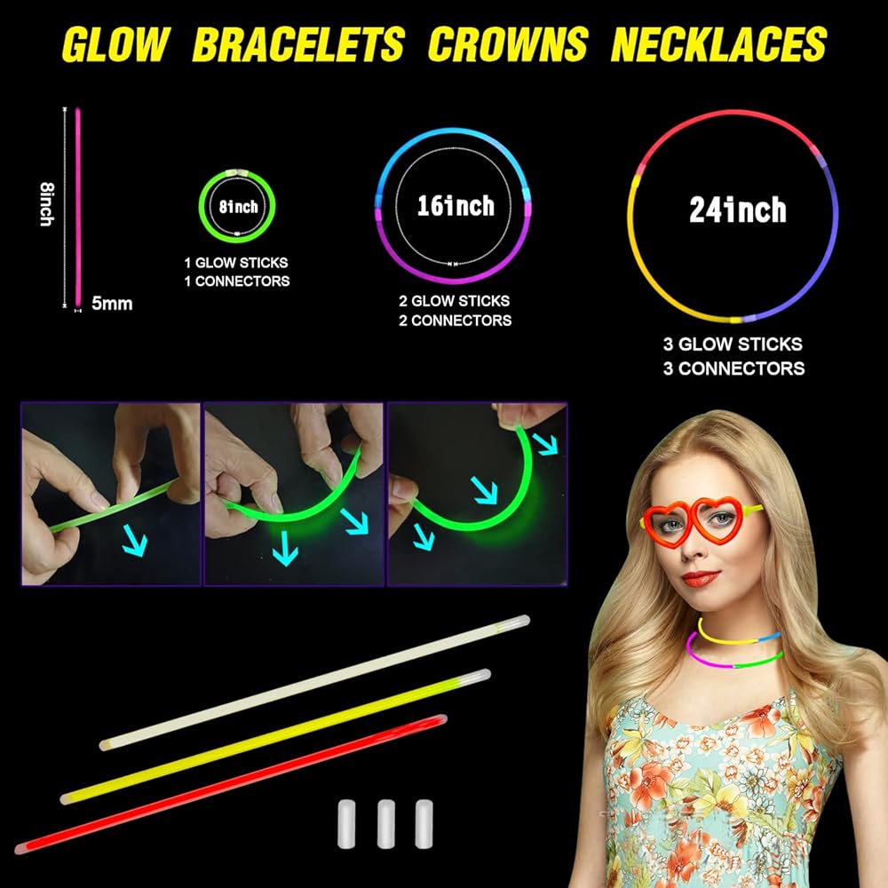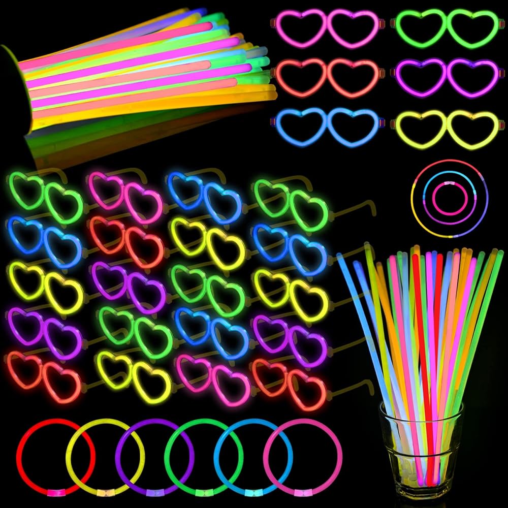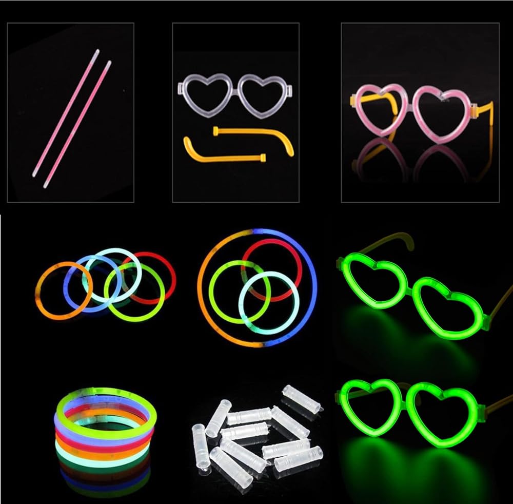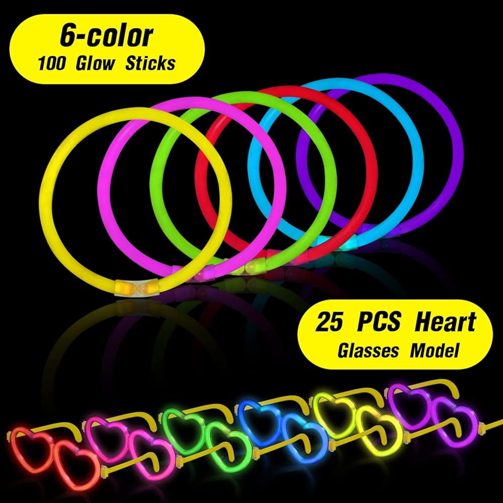 • لوازم الحفلات المتوهجة في الظلام - ستحصل على 100 عصا متوهجة مقاس 8 انش مع 100 موصل، و25 وضع نظارات على شكل قلب. يمكنك تجميع 25 قطعة من النظارات المضيئة و50 قطعة من الأساور أو القلائد. سوف تتوهج بشكل فائق السطوع لساعات من الإضاءة. رائع ولافت للنظر