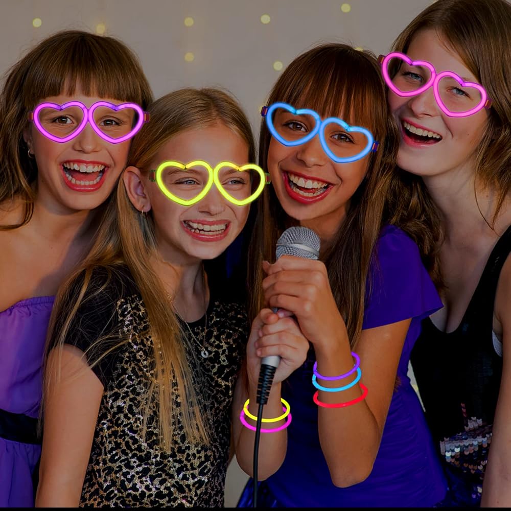• نظارات شمسية مضيئة - قم بثني العصا ثم اضغطها وهزها وستتوهج ثم أدخلها في أخدود النظارات على شكل قلب. إذا لم تقم بتشقق أو تفعيل العصي، يمكنك الاحتفاظ بها حتى حفلتك القادمة