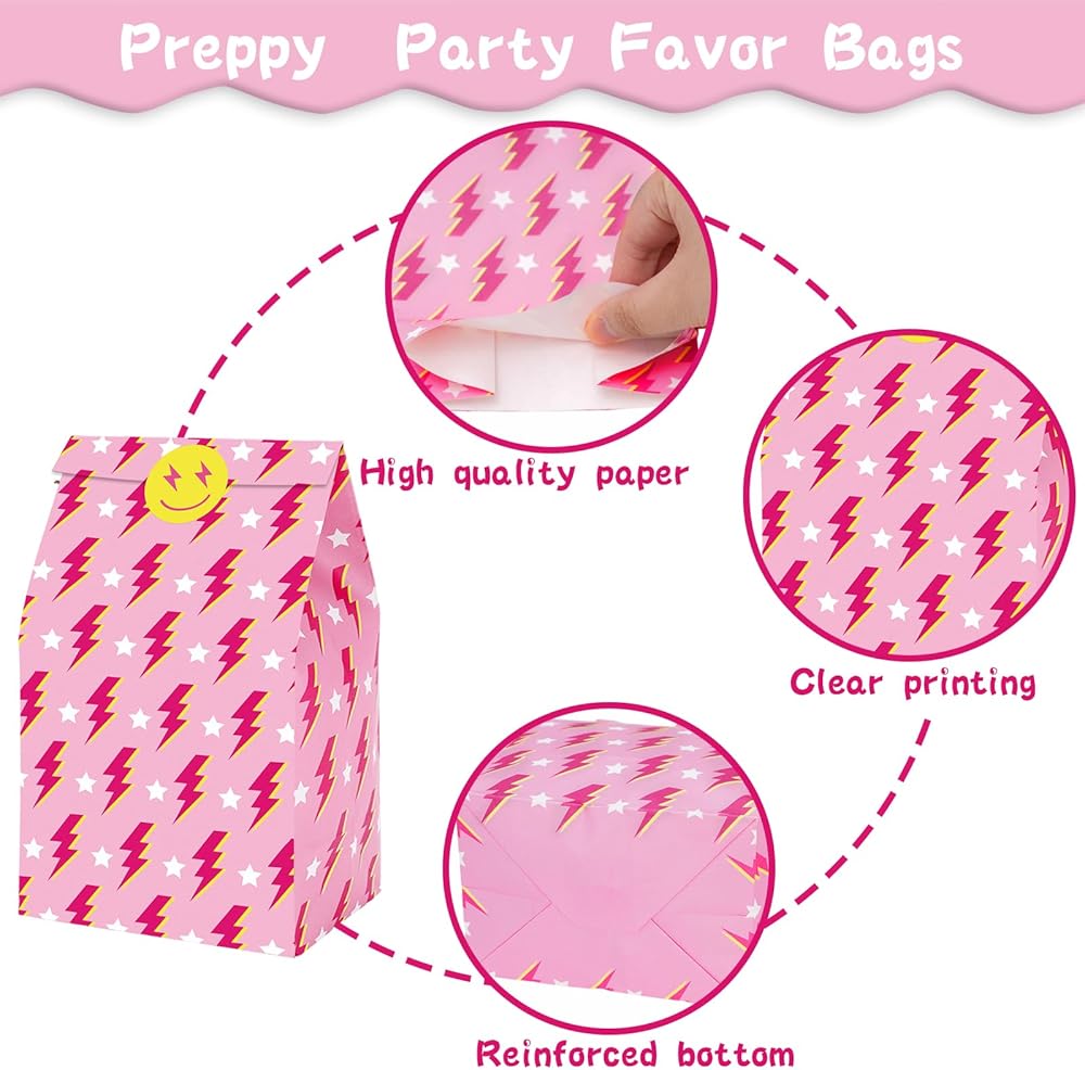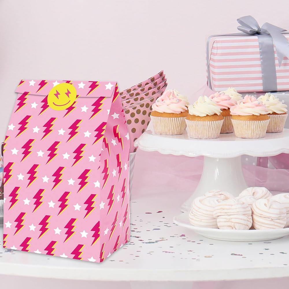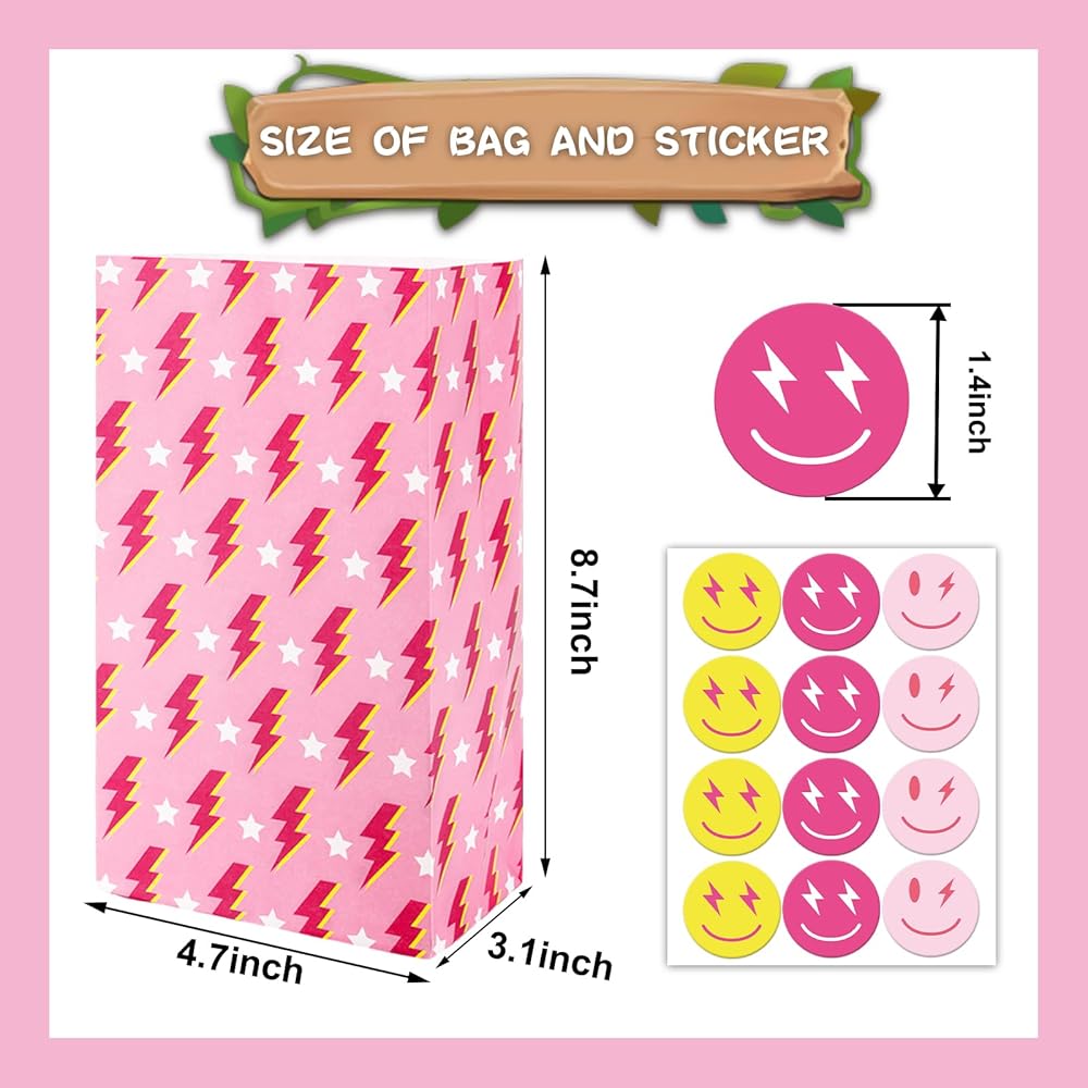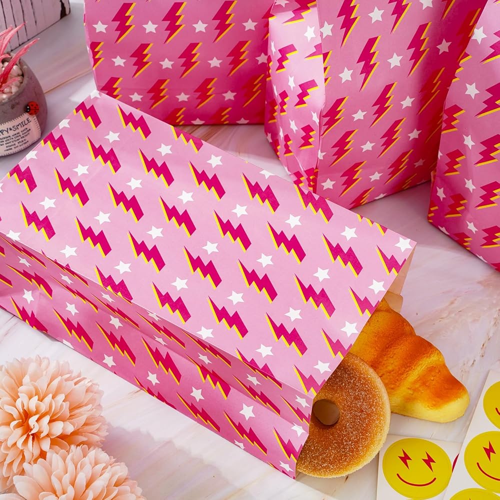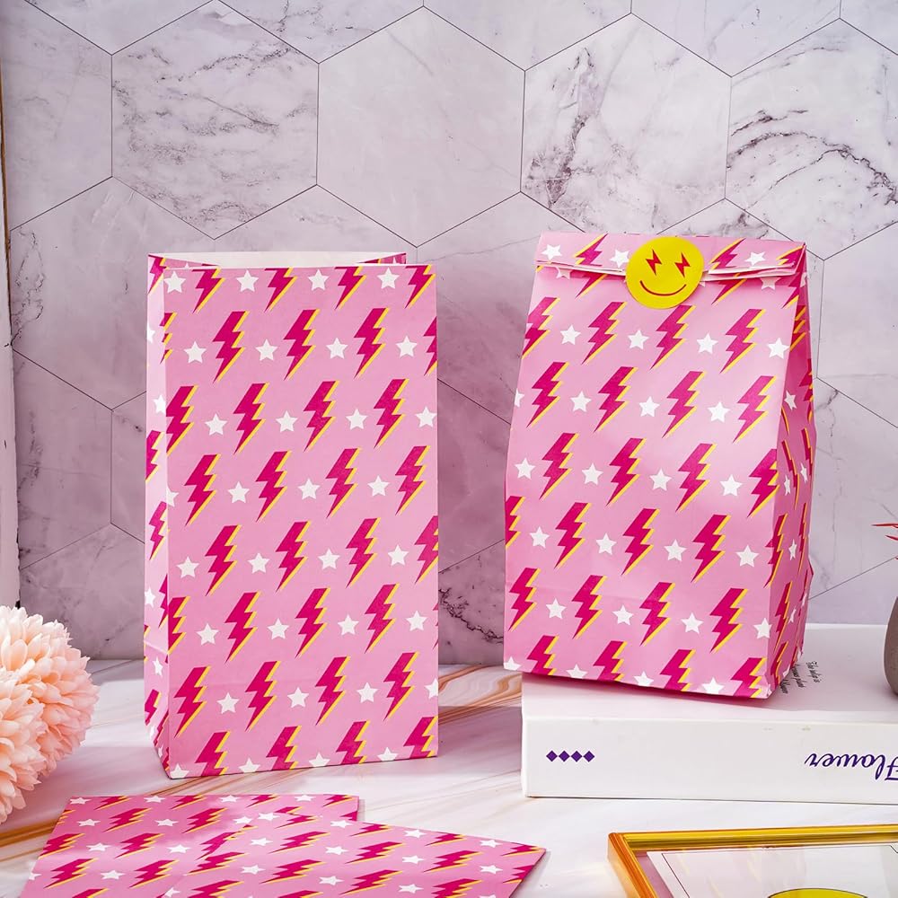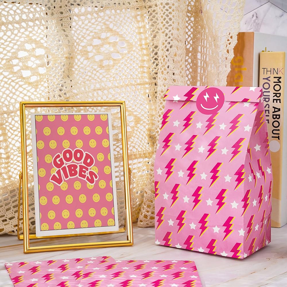 24 قطعة من اكياس هدايا حفلات بريبي من جارثينا ايه ام سي اس، اكياس هدايا ورقية بلون زهري فاقع مع ملصقات وجه مبتسم، اكياس حلوى لحفلات توديع العزوبية وحفلات الزفاف واعياد الميلاد
