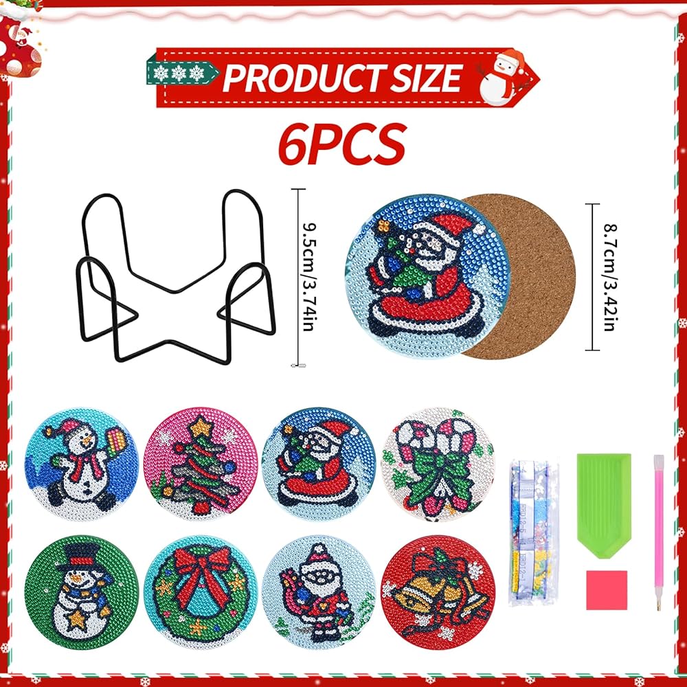 8 Pieces 5D DIY Round Christmas Diamond Coasters with Stand Christmas Pattern Full Drill Rhinestone Drinks Coasters with Cork Coaster Diamond Art Kits for Adults Kids Beginners Art Craft Supplies