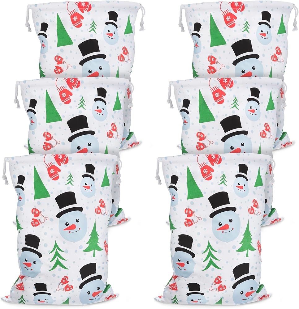 6 عبوات من أكياس هدايا عيد الميلاد القماشية القابلة لإعادة الاستخدام لرجل الثلج مقاس XL - بديل لتغليف العطلات بنمط لطيف - كيس قماش كبير الحجم مع رباط فاخر للهدايا الكبيرة - تخزين كبير جدًا مقاس 66 سم × 48 سم