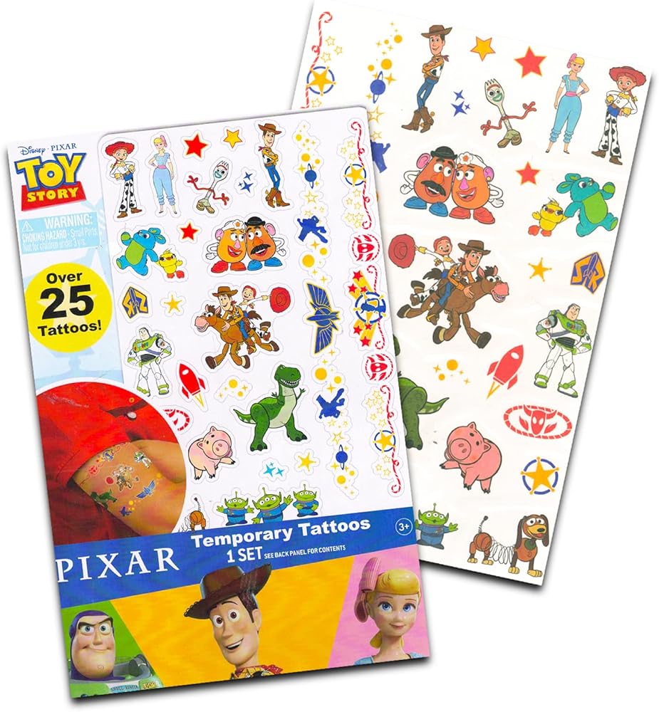 تتضمن 3 عبوات من وشوم ديزني من فيلم الرسوم المتحركة لعام 1995، توي ستوري. 78 تصميمًا ملونًا وممتعًا لشخصيات الفيلم.