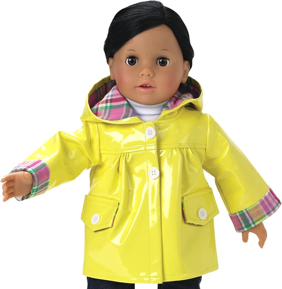 معطف مطر أصفر مع غطاء رأس وأساور أكمام مبطنة منقوشة يناسب دمى American Girl و Madame Alexander و صوفياز Dolls والمزيد!