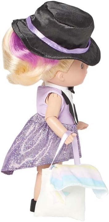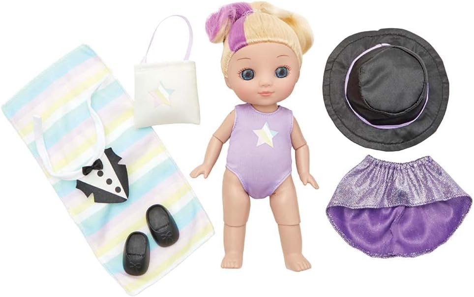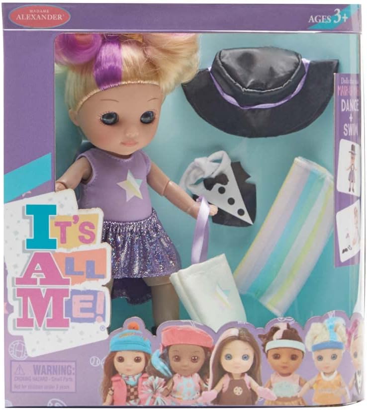 It's All Me! dolls mash-up of kids' favorite activities! Dance + Swim – includes swimsuit with dance skirt, ‘tuxedo' collar, shoes. Accessories include tote bag, towel, top hat. 8-inch tall highly poseable, engaging doll. Light skin tone, blue eyes, blonde hair with lavender highlight. Encourages imaginative play anywhere! Lively face with sparkling eyes, rooted hair. Quality craftsmanship that demonstrates "love is in the details." Packed in a window box. Doll wipes clean with a damp cloth. Recommended for age 3 and up.