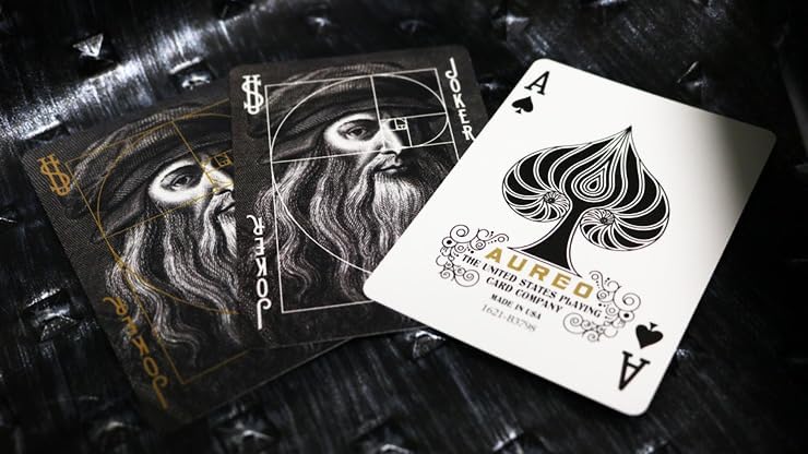 ABOUT THE DESGIN | In the early 1500s Leonardo Da Vinci illustrated "La Divina" (The Divine Proportion) a book written by mathematician Luca Pacioli that described a mathematical theory called "The Golden Ratio" which was used in Renaissance paintings and sculptures to achieve balance and beauty. Da Vinci later called this sectio aurea or the Golden section. The gold foil and swirl designs on the tuck bring the Golden ratio to life in this unique deck of cards.