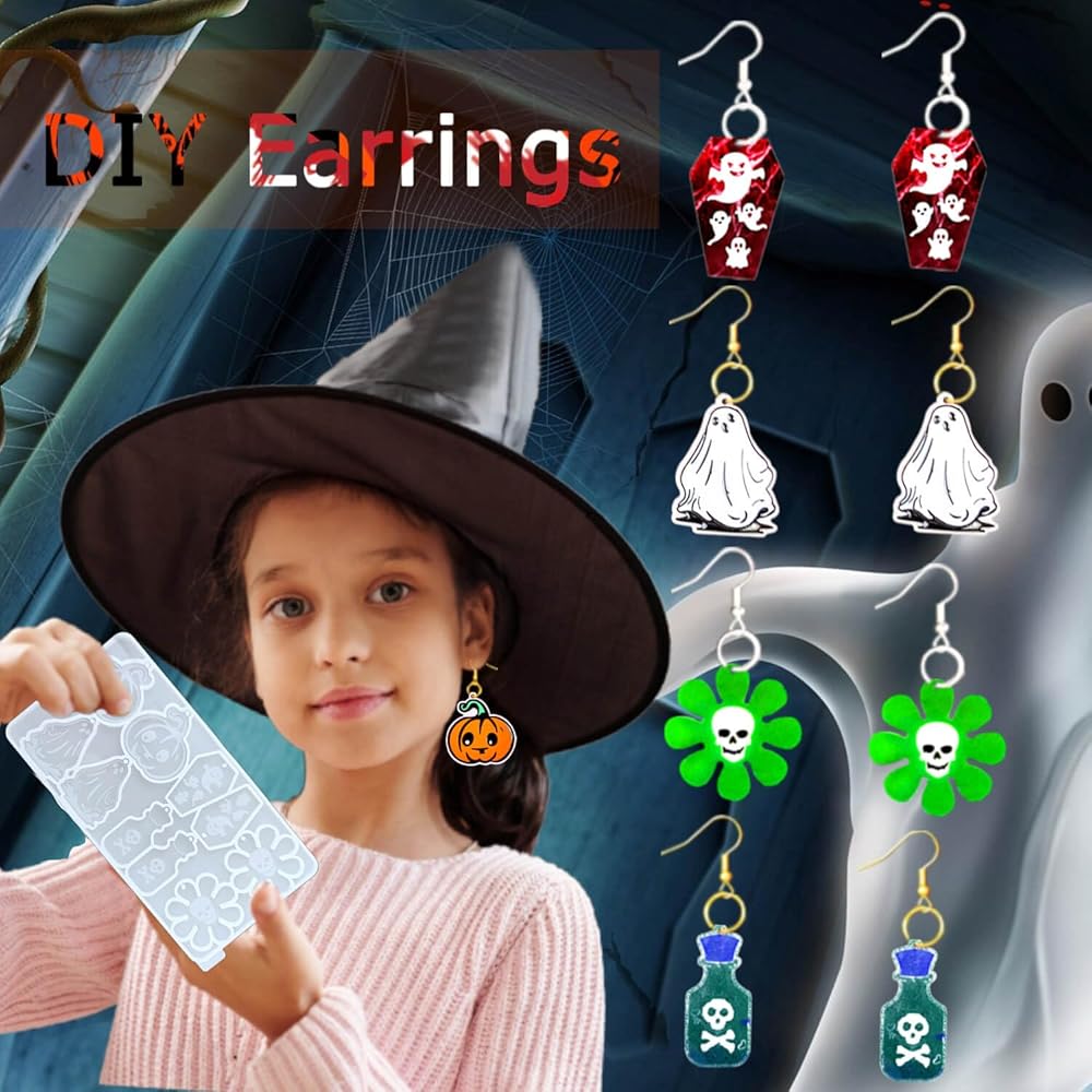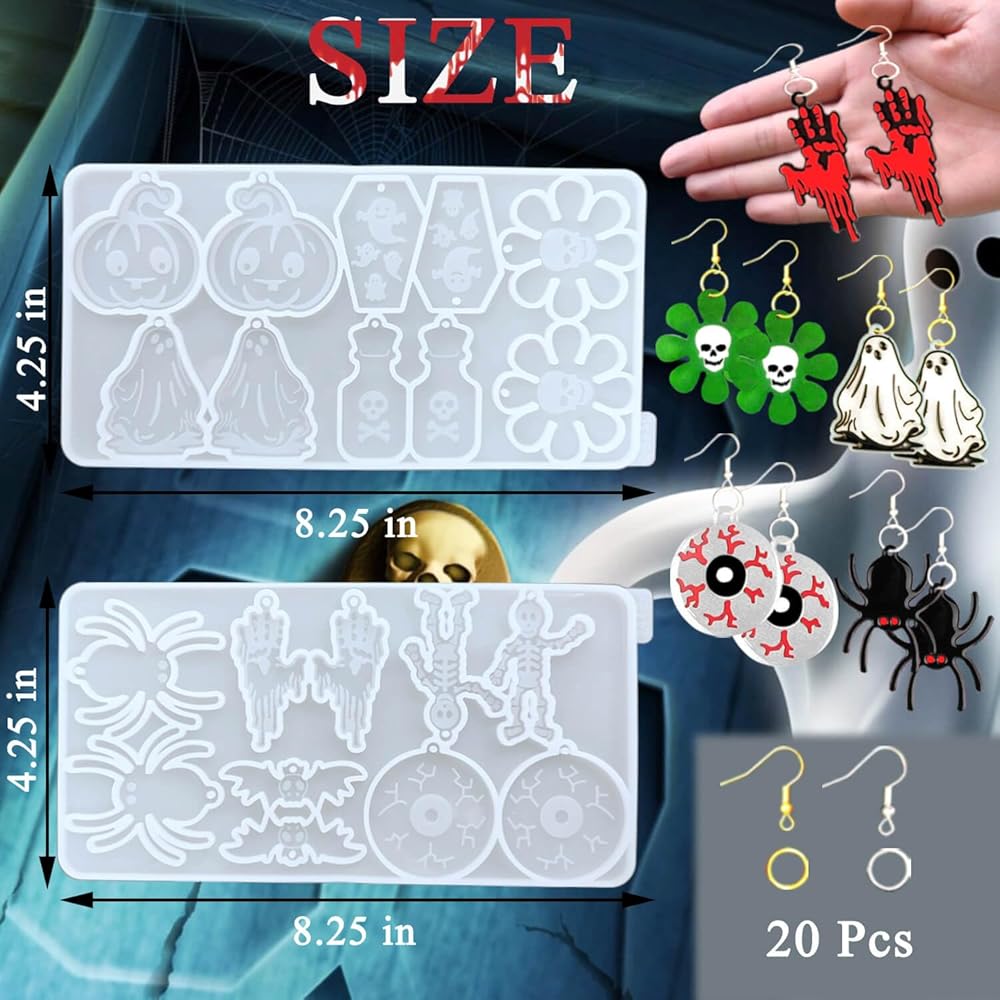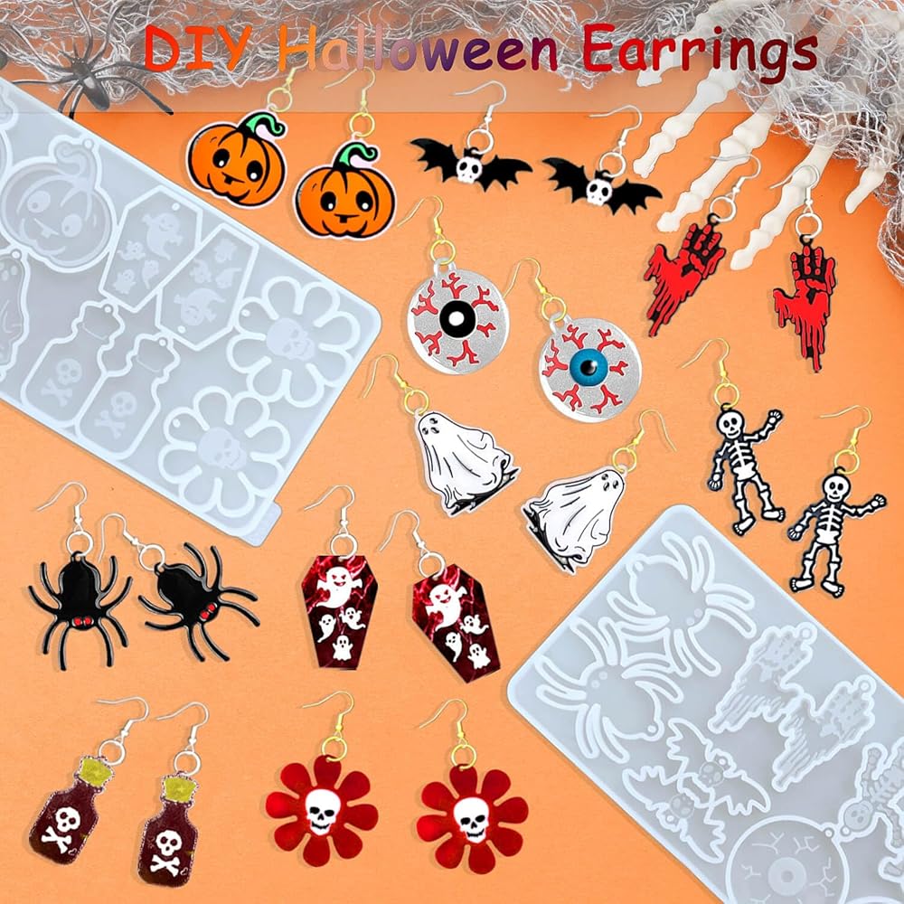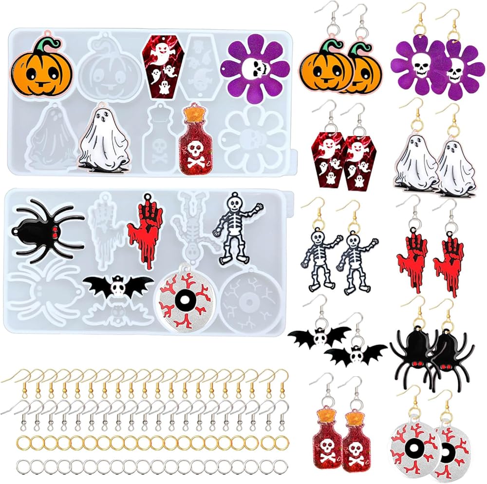 ريفاندا 82 قطعة من قوالب راتنج الهالوين مع فتحة، 10 ازواج من قوالب الايبوكسي السيليكون للهالوين مع 40 خطاف اقراط هالوين اليقطين الخفافيش العنكبوت سلسلة المفاتيح قالب الراتنج