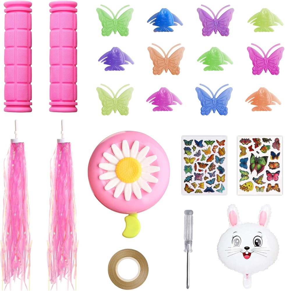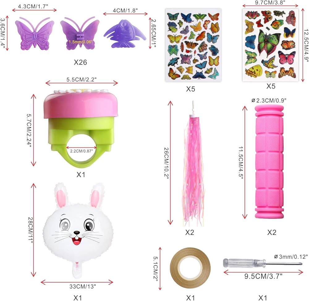 1 جرس دراجة + 2 مقود + 2 قطعة شرائط + 26 قطعة خرز عجلة + 10 قطع ملصقات + 1 بالون + 1 شريط بالون + 1 قطعة مفك براغي (9.7 سم/3.6 انش)