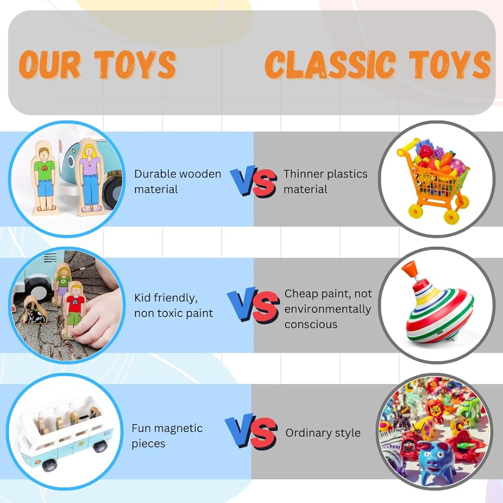 شاحنات خشبية متينة بتصميمات أصلية. تحتوي الشخصيات والشاحنات على مناطق مغناطيسية حتى "تلتصق" في أوضاع حول اللعبة لمزيد من المرح.