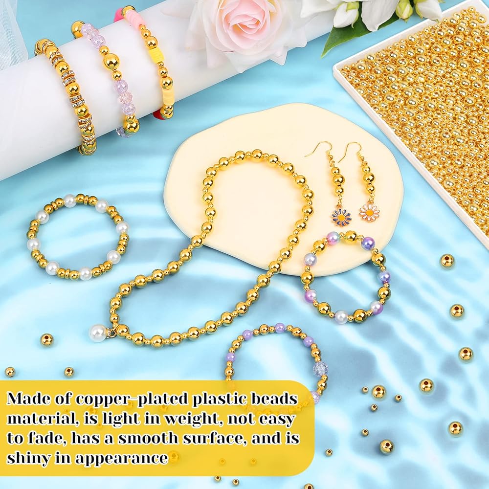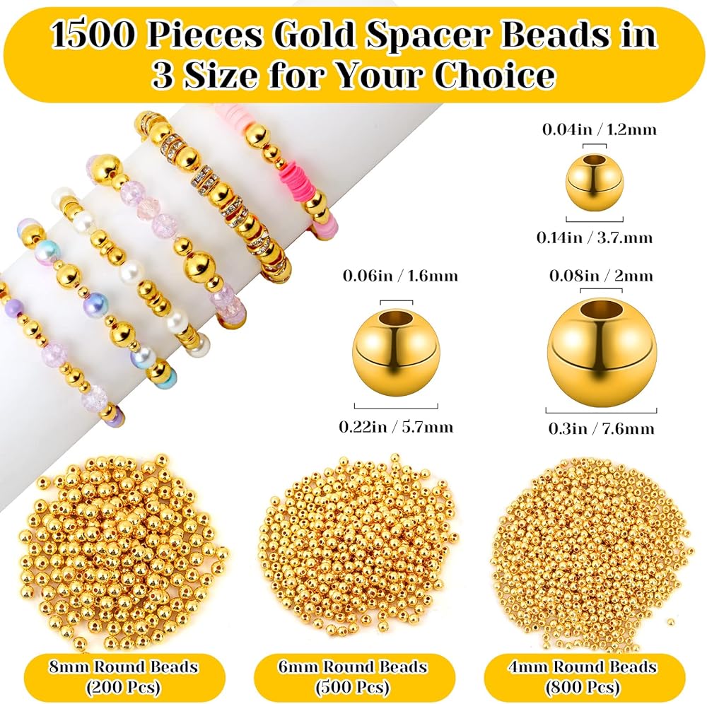 1500Pcs Gold Beads for Jewelry Making, 800Pcs 4mm Smooth Round Beads,500Pcs 6mm Seamless Loose Ball Beads, 200Pcs 8mm Spacer Beads for DIY Crafts Necklace, Bracelet, and Earring Making