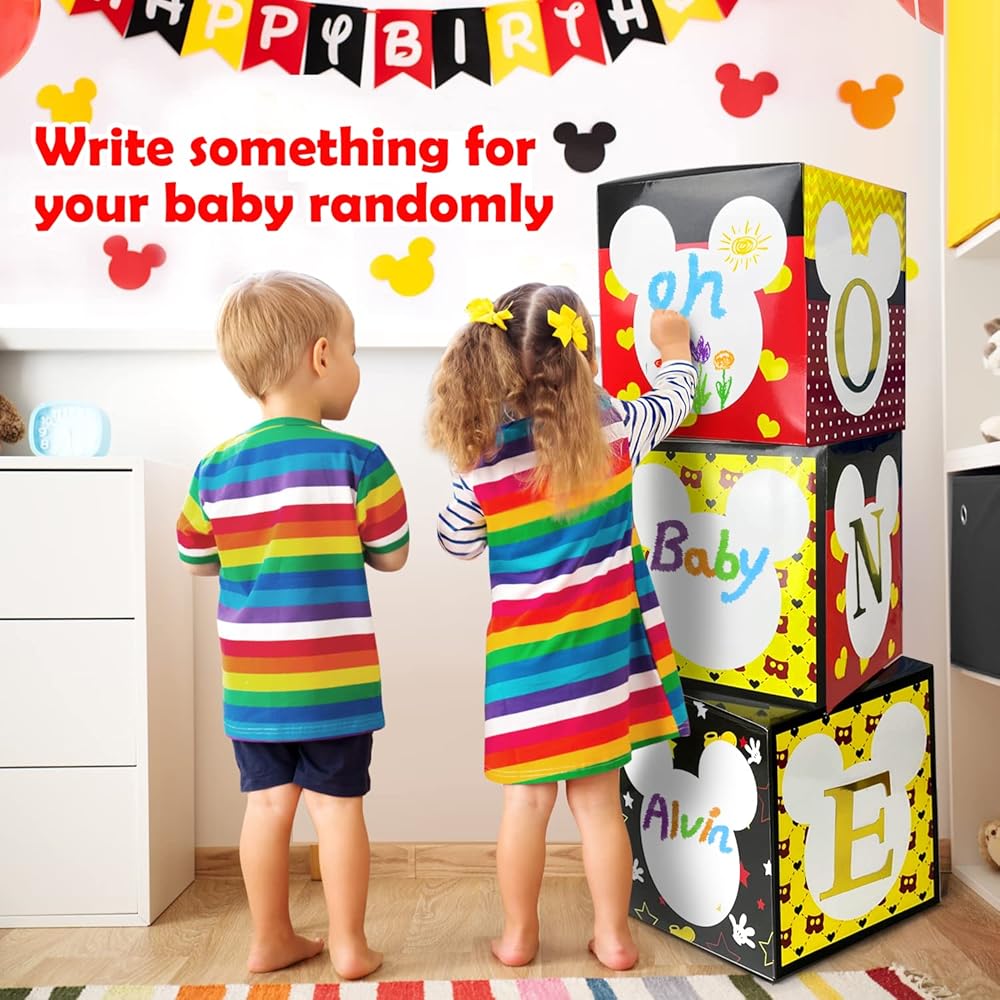 كراكو لوازم حفلات عيد الميلاد الاول بتصميم ميكي - 3 مكعبات ماوس بلون اسود واصفر مع حرف واحد، هدايا حفلات استقبال المولود للاولاد والبنات والاطفال (البالونات غير متضمنة)