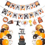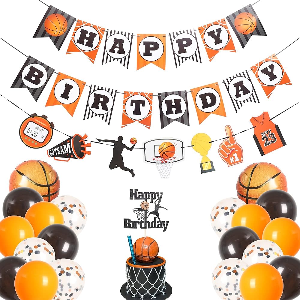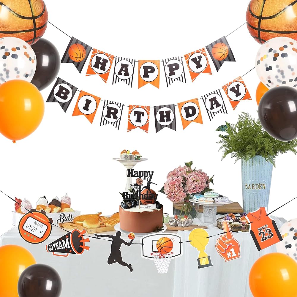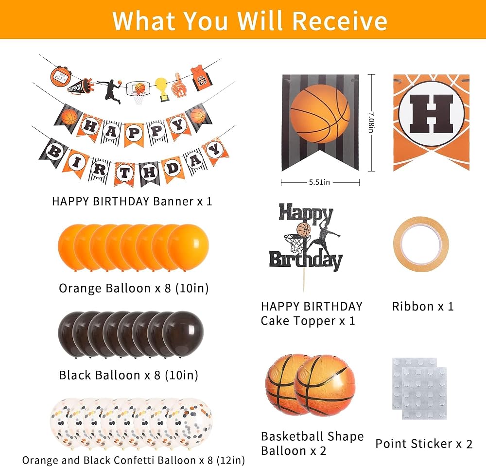 PERFECT BASKETBALL BIRTHDAY PARTY DECOR - Package includes basketball happy birthday banner x1, basketball theme banner x1, basketball happy birthday cake topper x1, basketball shaped foil balloon x2, orange balloons x8, black balloons x8, orange and black confetti balloon x8 and some point stickers x4, which will light up your basketball party backdrop decoration