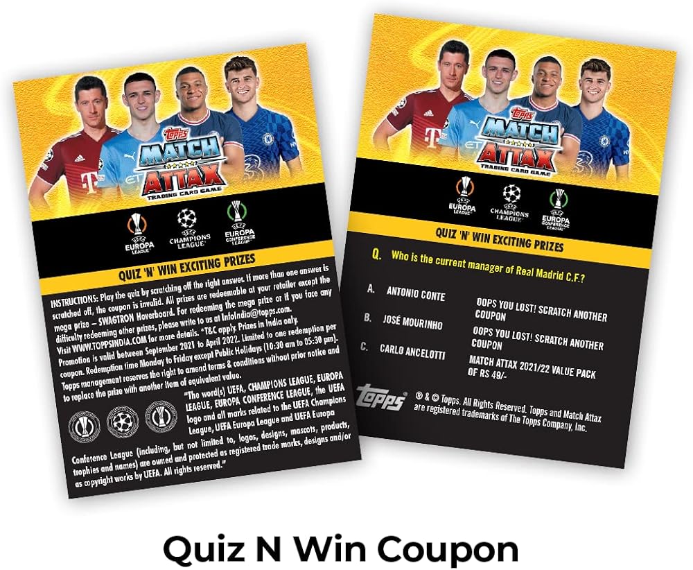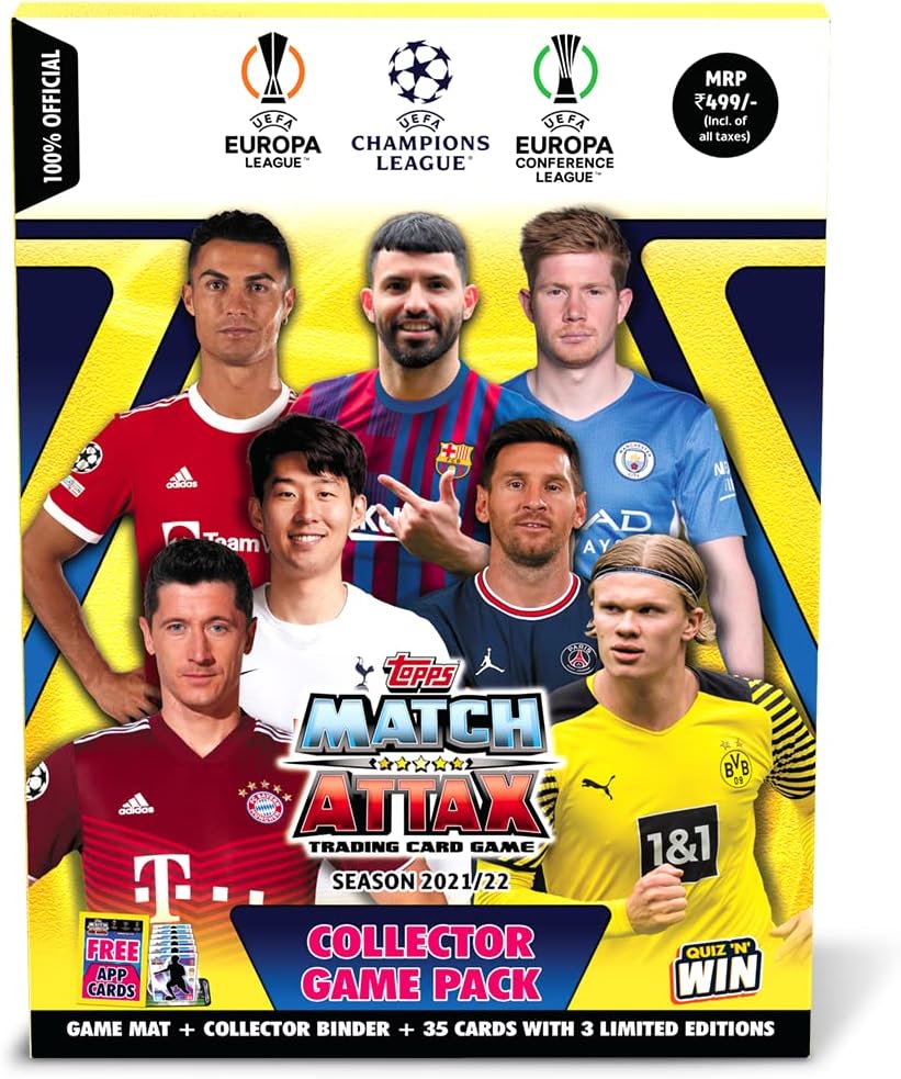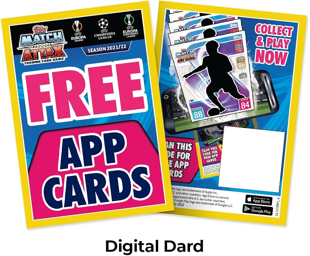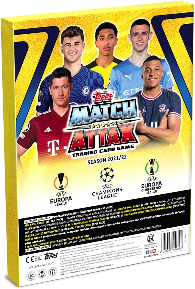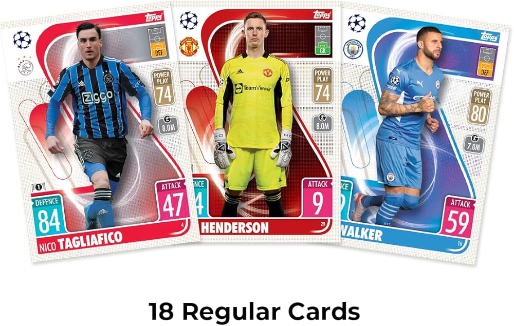 "استعد للموسم الجديد تمامًا! مع 536 بطاقة لجمعها، تتميز ماتش اتاكس 2021/22 بأكبر نجوم كرة القدم من دوري أبطال أوروبا ويفا ودوري مؤتمرات أوروبا. ستكون أقرب من أي وقت مضى إلى أبطالك مع لاعبين مثل ميسي وهالاند ومبابي ونيمار وسانشو وستيرلنج في انتظار العثور عليها! إليك ما يجب البحث عنه... البطاقات الأساسية - بطاقات لاعب ريجوالر، تعزيز شارة الفريق، بطاقات الكابتن والتكتيك! بطاقات فويل - نمط مميز، الجيل القادم، الأم، الماجستير، المبتدئ، الذكرى الخامسة عشرة، 100 نادي، 101 لا يهزم! احصل على بطاقة لامعة مضمونة في كل عبوة! ابحث عن ايبيك جيمستون لي، باور اكوا لي، هاتريك هيرو لي، بلو لو انسايد لاكي باكس!