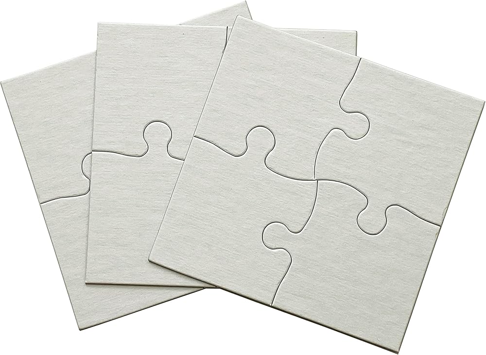 Pre-cut blank puzzles made from sturdy white paperboard 9 piece 4" x 5-1/2" 24 pieces per package. Puzzles can be decorated with oil and water-based artist paints, mediums, inks, watercolors, markers, pencisl crayon etc. Easy to separate and assemble. Accepts water-based ahesives. (Choking Hazard - Small Parts)