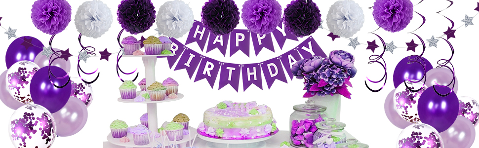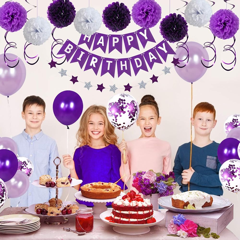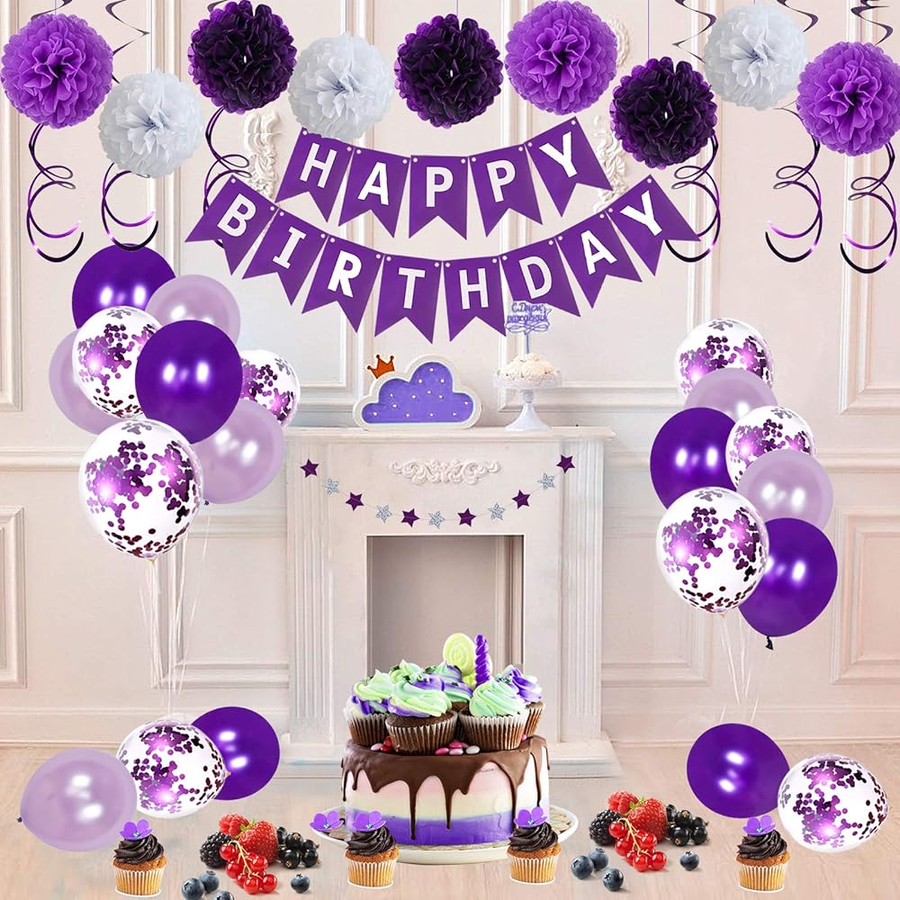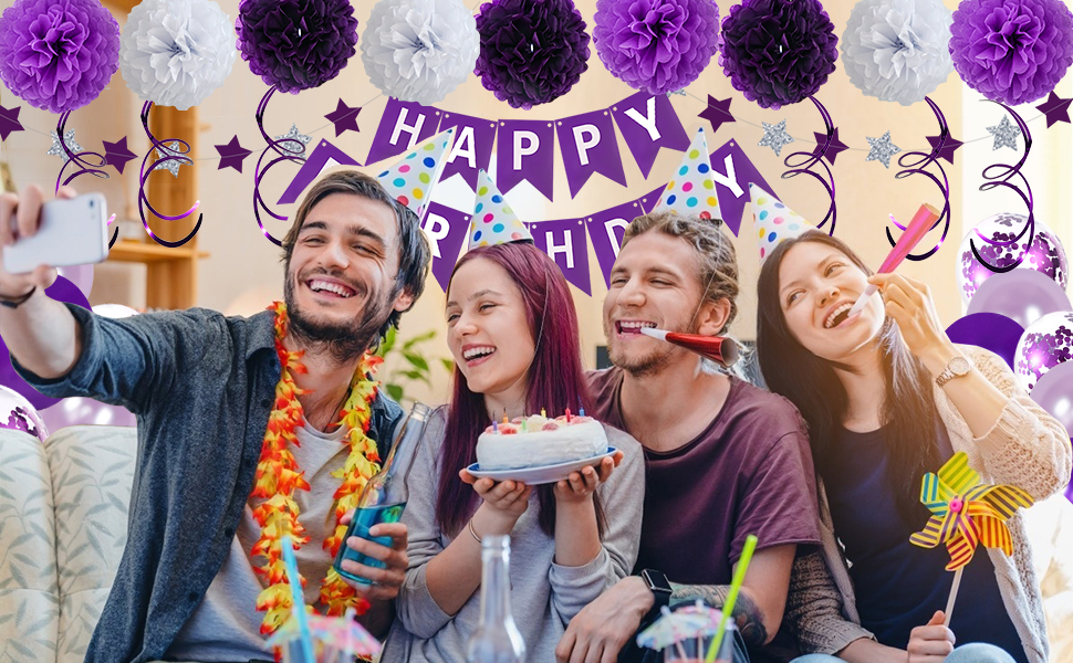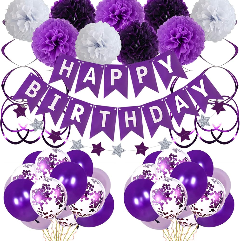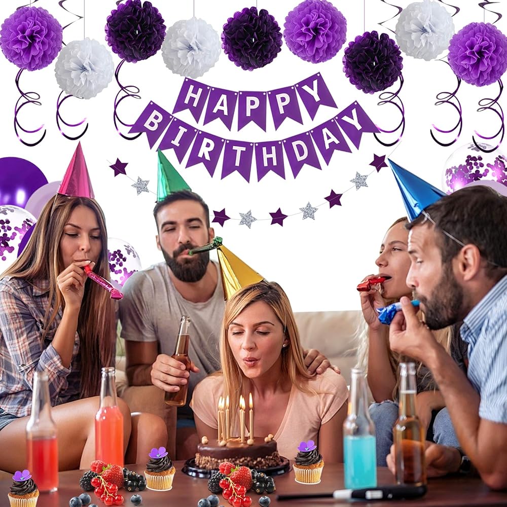 زينة عيد الميلاد للفتيات والنساء، ديكورات الحفلات الأرجوانية مع زينة عيد ميلاد سعيد مع لافتة من الرايات، بالونات، بومبوم، دوامة معلقة لبدلة ديكور حفلات الذكرى السنوية والخطوبة