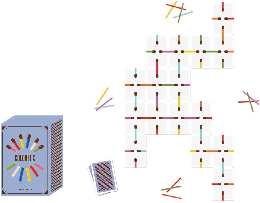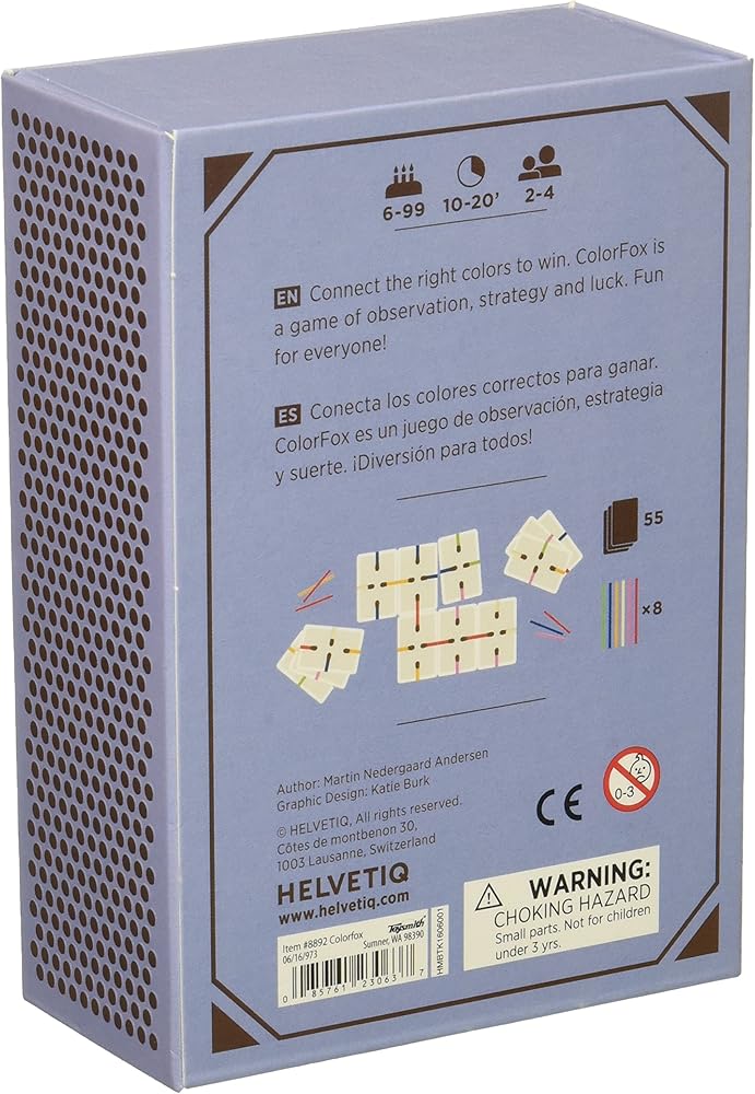 Helvetiq publishes games for kids, families, and adults in print and digital formats. These games are designed to test people's knowledge in a way that is both fun and instructive. Colorado is dominoes with a tactical twist. Shuffle the cards, deal three to each player, then flip one card over in the center of the table. The game is a little like dominoes, in that you need to place the colored matches next to the same color (and facing the same direction). connect as many cards as possible to win colored matches. Outfox the other players by collecting the most complete sets of matches to win the game. When you match one matchstick color, you receive a colored match of that same color from the matchstick bank. Color fox measures 5-1/2 inches x 3-3/4 inches x 2 inches. This item is recommended for ages eight years and up.