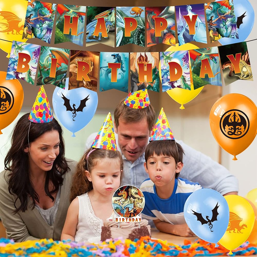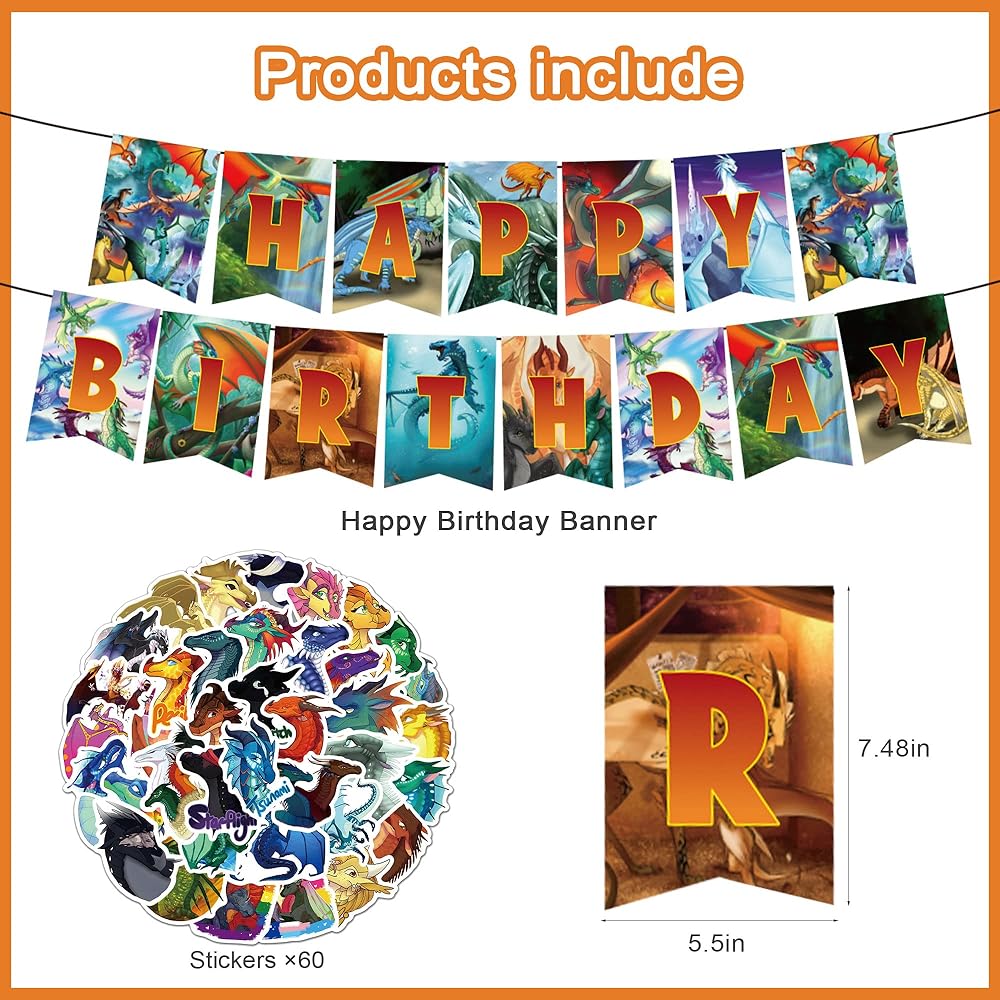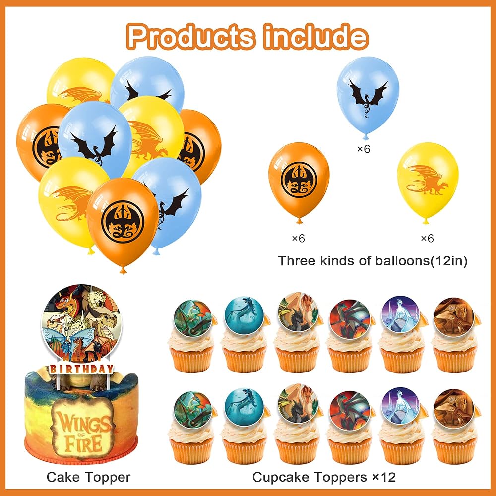 • ديكورات حفلات بطابع التنين: تتضمن لوازم حفلات أعياد الميلاد بنمط أجنحة النار لافتة عيد ميلاد سعيد و1 زينة كعكة كبيرة و12 قطعة علوية للكب كيك و18 بالون و60 ملصقًا. إنها مناسبة جدًا لتوفير شعور أكثر احترافية لتجمعات أطفالك، وأكثر أمانًا ومتعة.