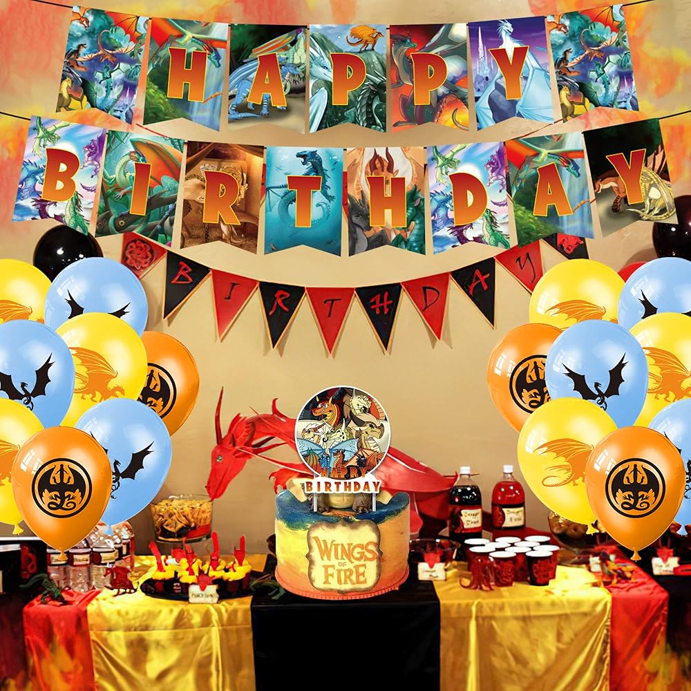 92 قطعة من ديكورات الحفلات بنمط اجنحة النار، لوازم حفلات اعياد الميلاد بطابع التنين تتضمن لافتة عيد ميلاد سعيد وبالونات وزينة كب كيك وملصقات لتزيين حفلات الاطفال والبالغين