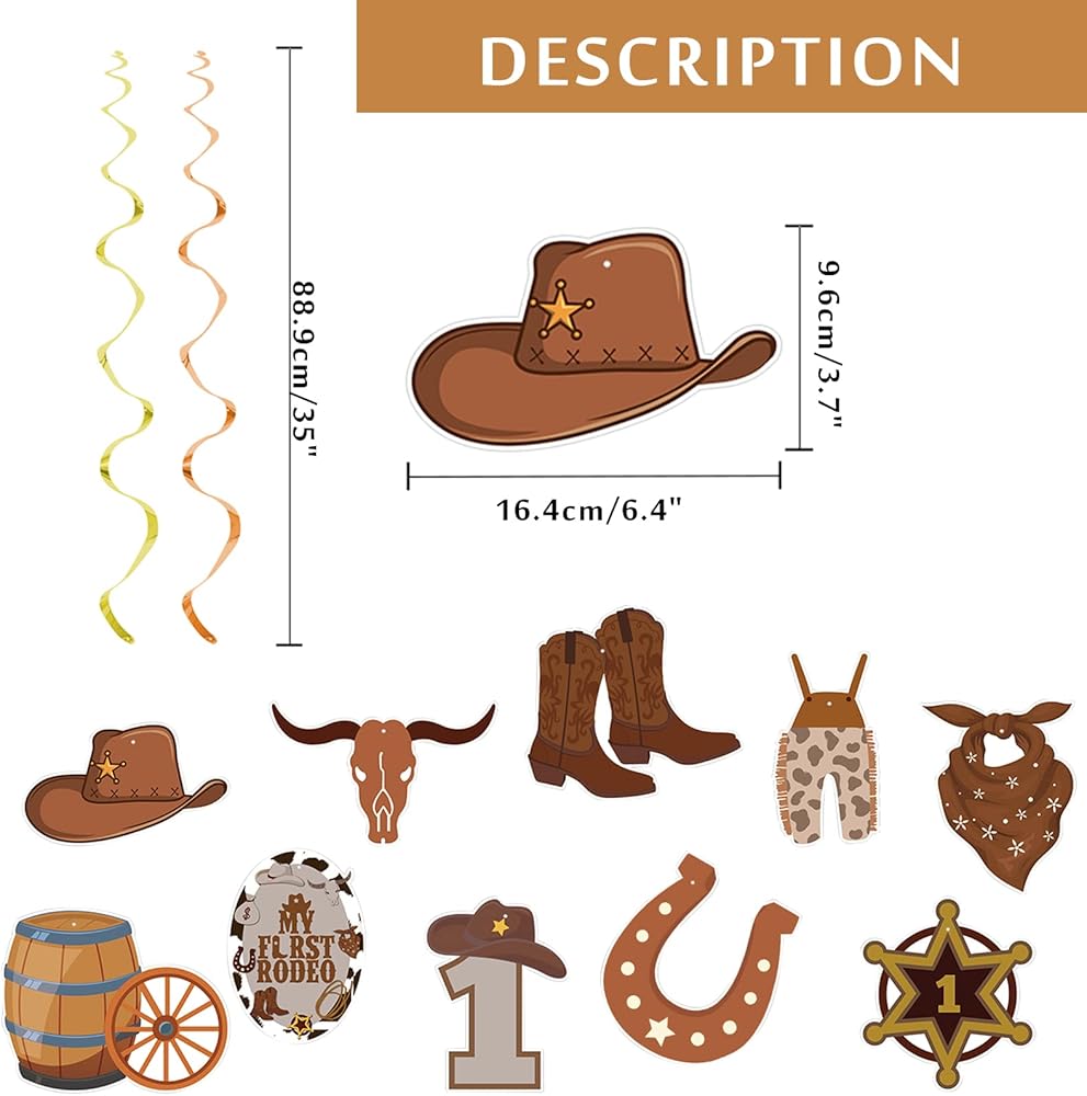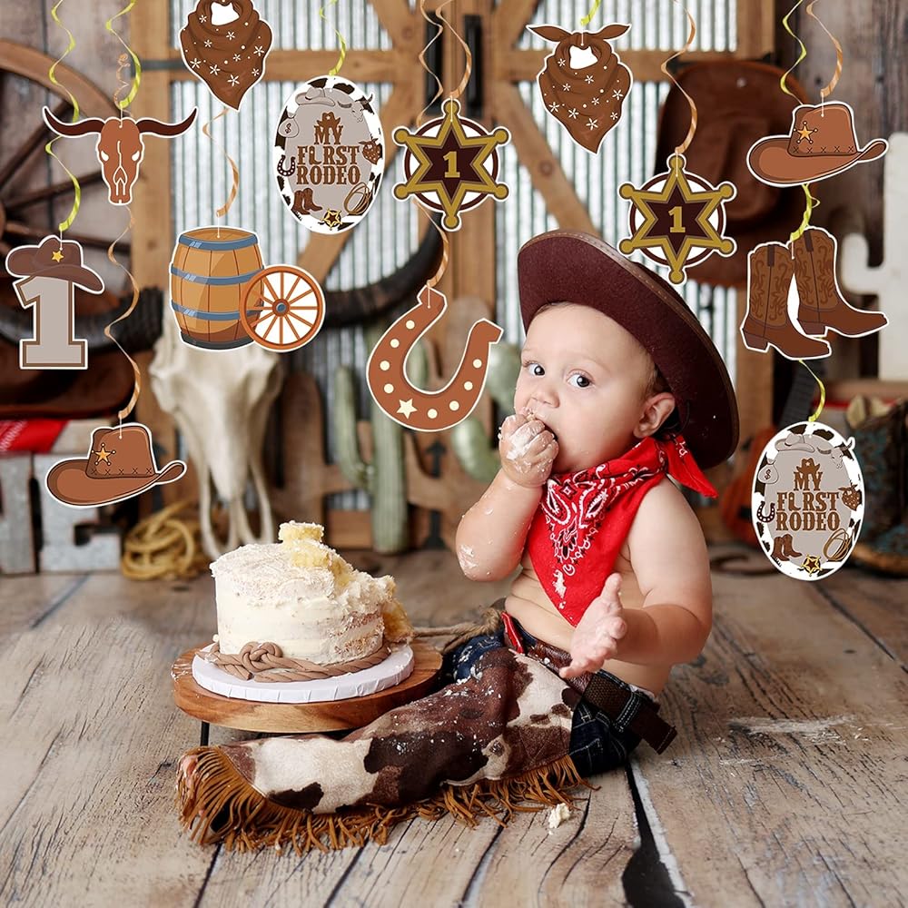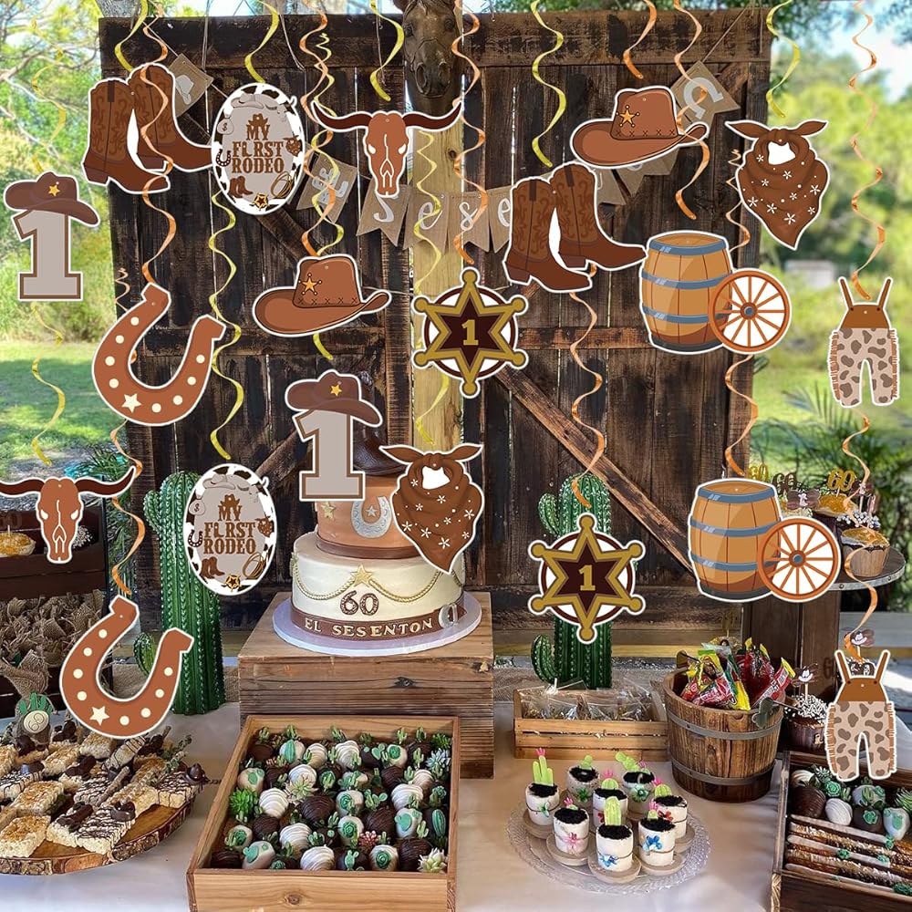 زينة حفلات رعاة البقر ماي فيرست روديو لحفلات اعياد الميلاد للاولاد من مستلزمات الحفلات ذات الطابع الغربي، دوامات معلقة من الرقائق المعدنية لتزيين اعياد الميلاد للحفلات الريفية الغرب المتوحش