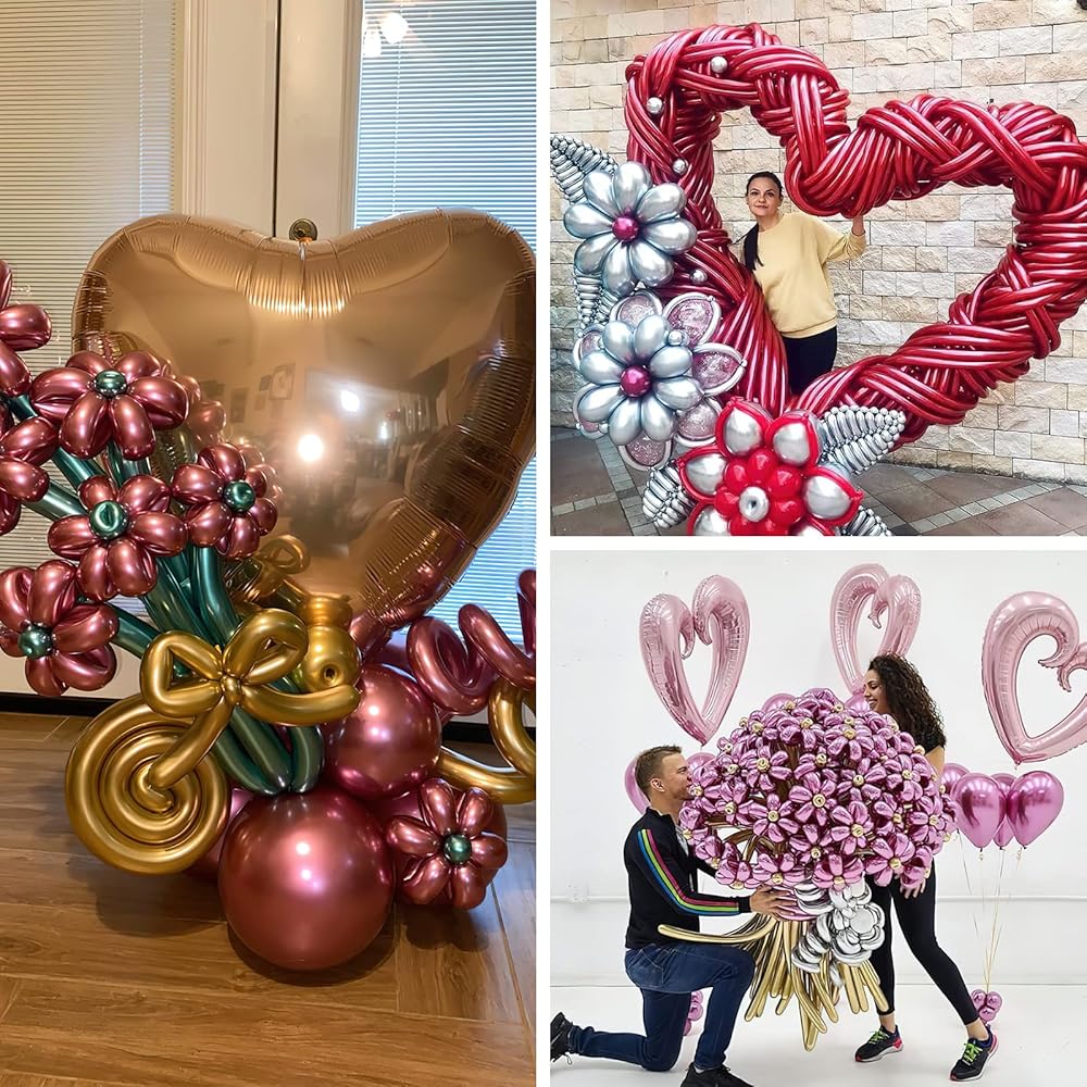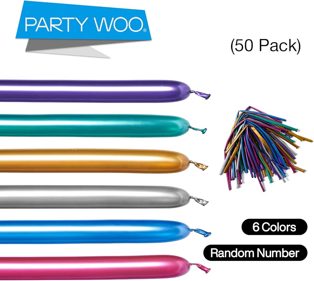 اللون: بالونات ملتفة ذهبية وفضية ملتفة وبالونات ملتوية زرقاء وبالونات ملتوية خضراء وأرجوانية وبالونات ملتوية حمراء المادة: بالونات لاتكس محتويات العبوة: 50 قطعة من بالونات الكروم الطويلة 260 كيو في 6 ألوان معدنية (قطر 2 انش، طول 60 انش؛ عدد البالونات من كل لون متوسط نسبيًا)