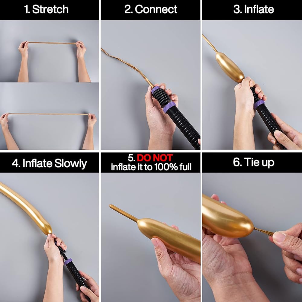 ماذا تملأ: يوصى باستخدام مضخة يدوية للبالونات لنفخ بالون التشكيل، لأنه من الصعب نفخ البالونات الملفوفة بالفم. عند النفخ بمضخة البالونات، يرجى محاولة نفخ هذه البالونات السحرية بالطول الذي تحتاجه في أقرب وقت ممكن