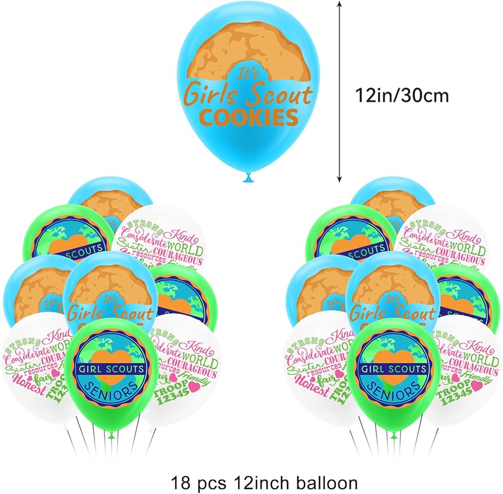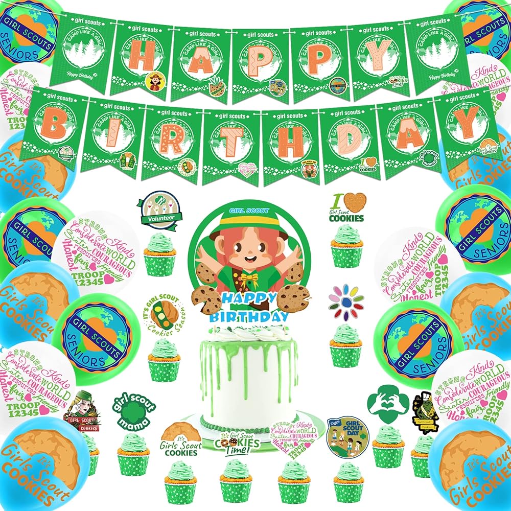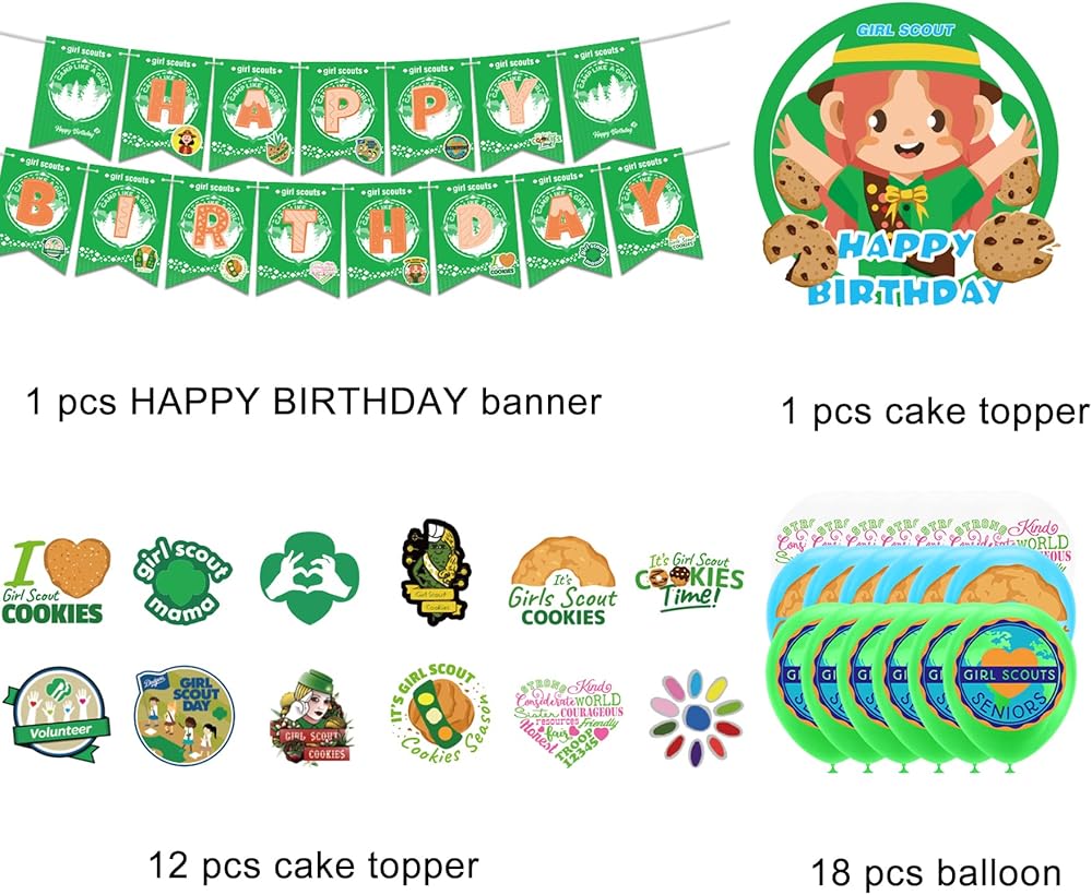 محتويات العبوة: تتضمن مجموعة لوازم حفلات أعياد الميلاد للفتيات الكشافة لافتة عيد ميلاد سعيد، 18 × بالون لاتكس (3 أنماط من 6 لكل منها)، 1 × زينة للكعك، 12 × زينة كب كيك، كل ملحق يحتوي على عناصر كشافة للفتيات، ستضيف هذه الديكورات المرح إلى حفلتك