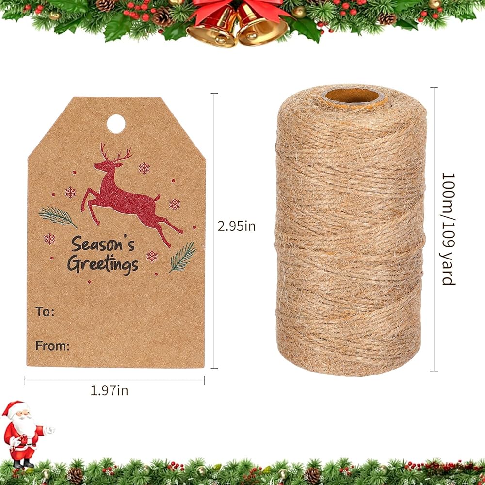 محتويات العبوة: 100 قطعة من بطاقات عيد الميلاد للهدايا مع 10 أنماط مختلفة ولفة واحدة من خيوط الجوت الطبيعية.