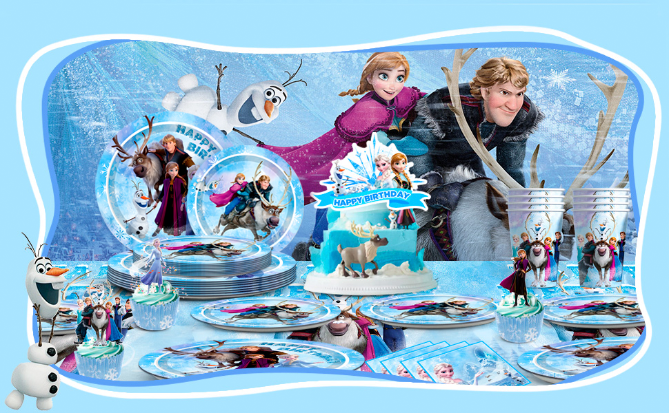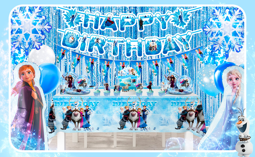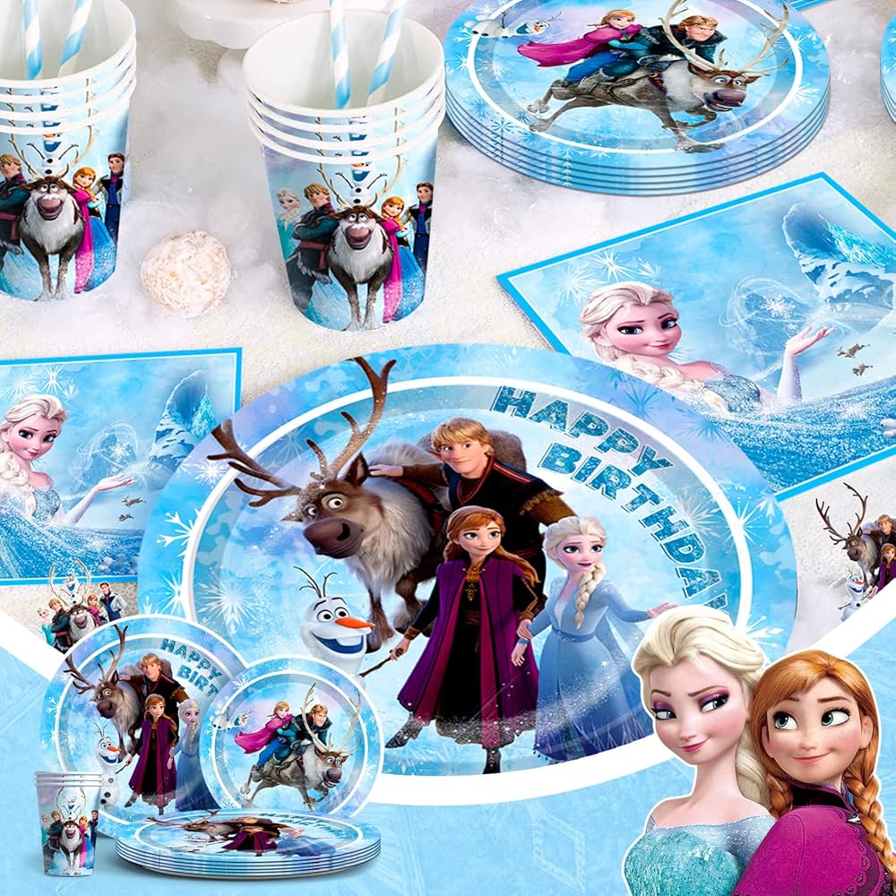 ❄ موضوع تزيين فرو-زن❄ تتضمن لوازم حفلات أعياد الميلاد بطابع إلسا ديكورات حفلات أعياد الميلاد بنمط فرو-زين وأدوات مائدة للحفلات تتميز بنفس التصميم بطابع فرو-زن، مما يجعل مكان عيد الميلاد الخاص بك يبدو وكأنه في أرض العجائب الشتوية الثلجية.