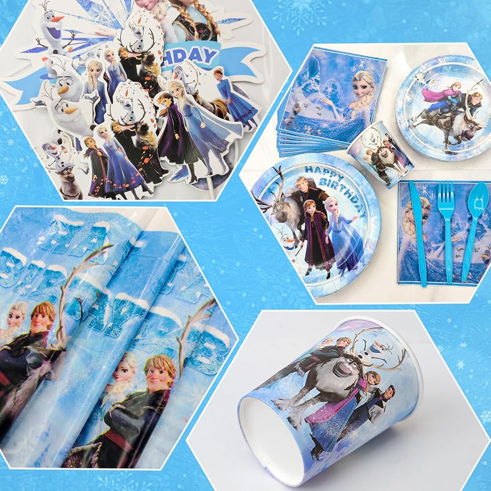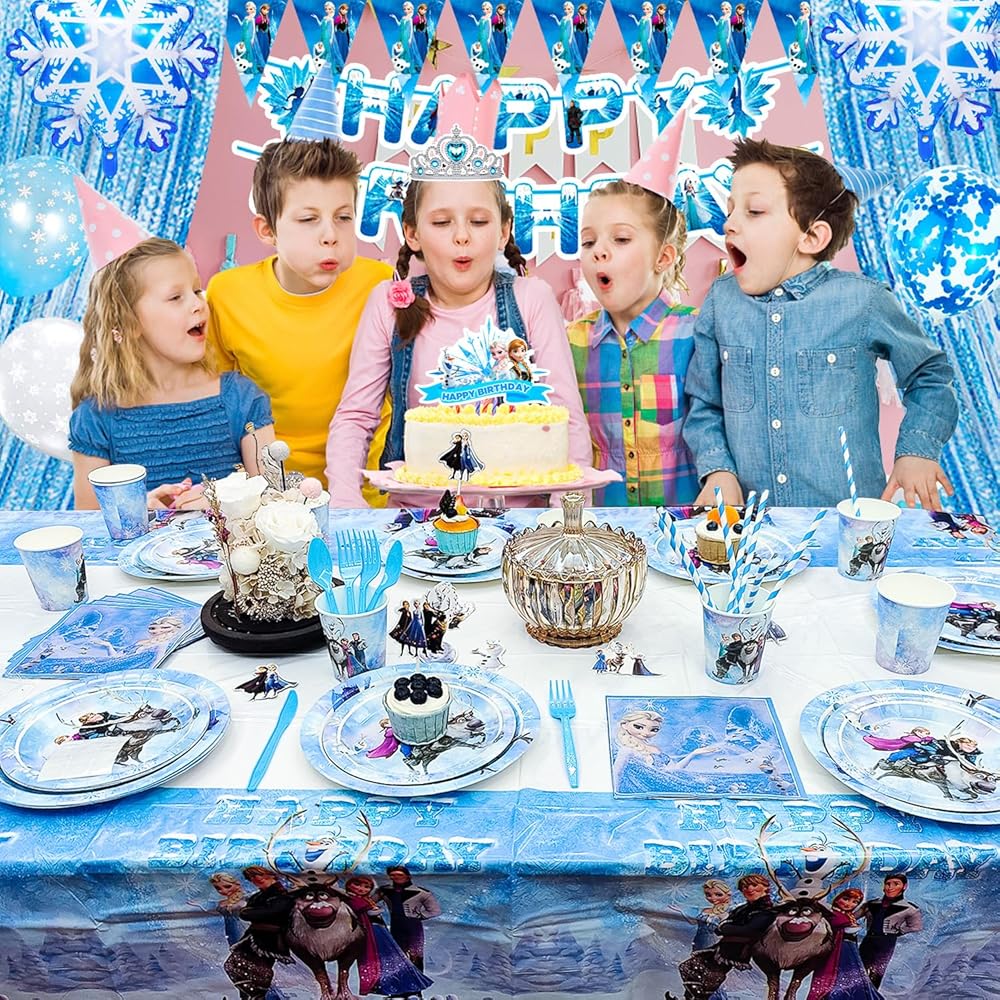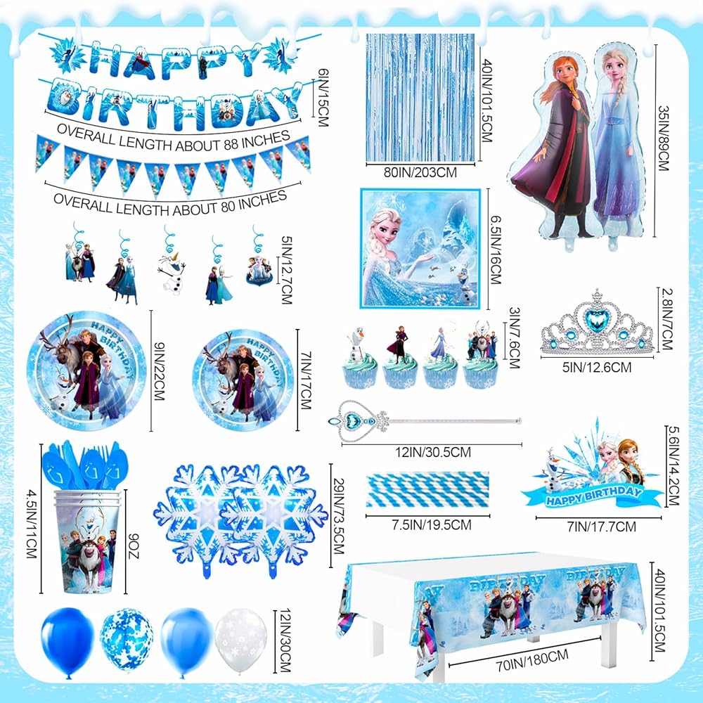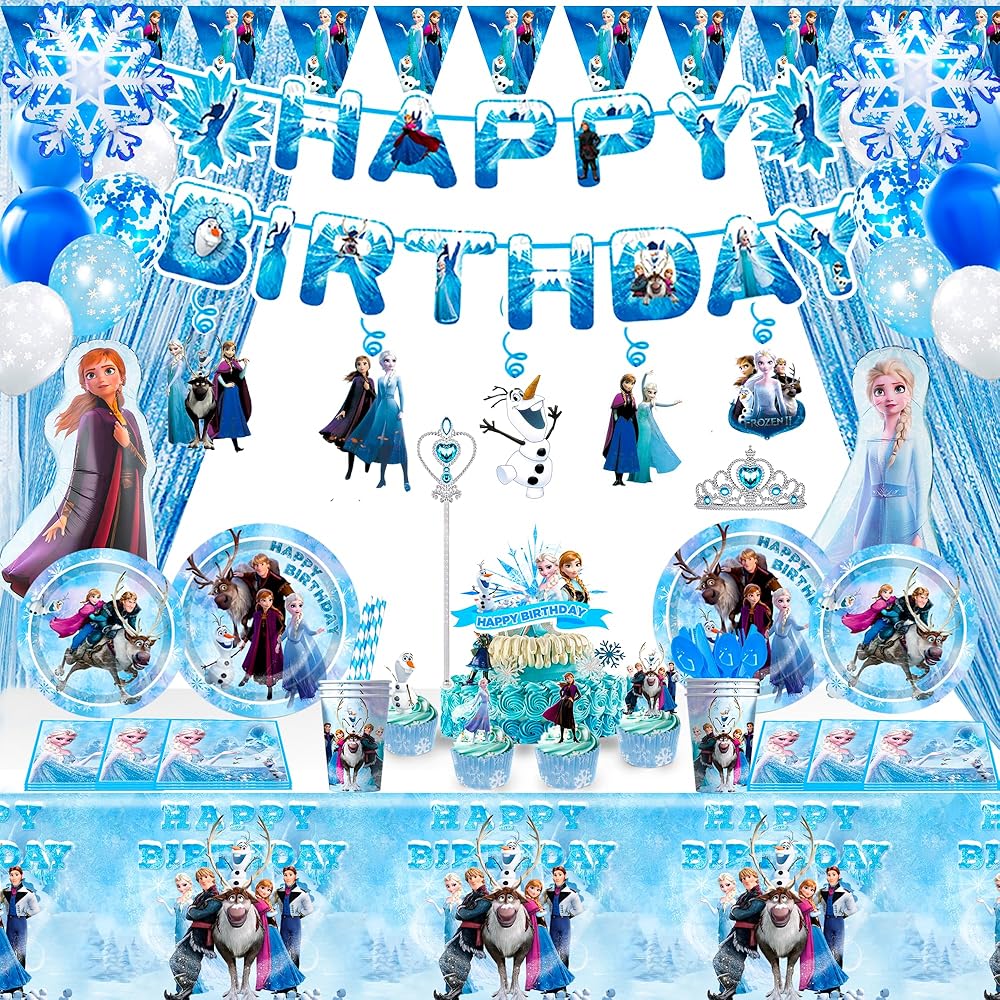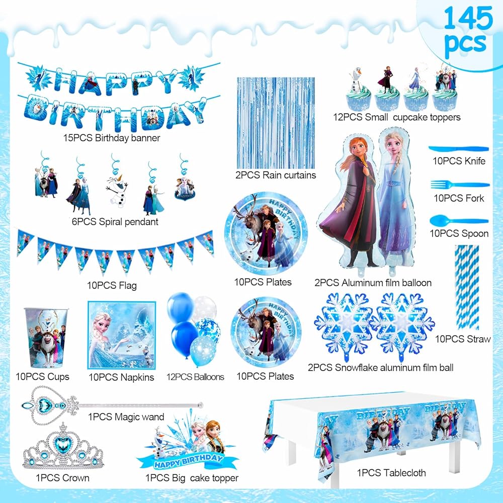 لوازم حفلات اعياد الميلاد من فروزن، مجموعة من 145 قطعة من ديكورات الحفلات وأدوات المائدة - أطباق حفلات فرو-زين ومناديل وأكواب ومفرش طاولة وبالونات ولافتة تاج وعصا وغيرها من ديكورات عيد الميلاد للبنات من فرو-زين