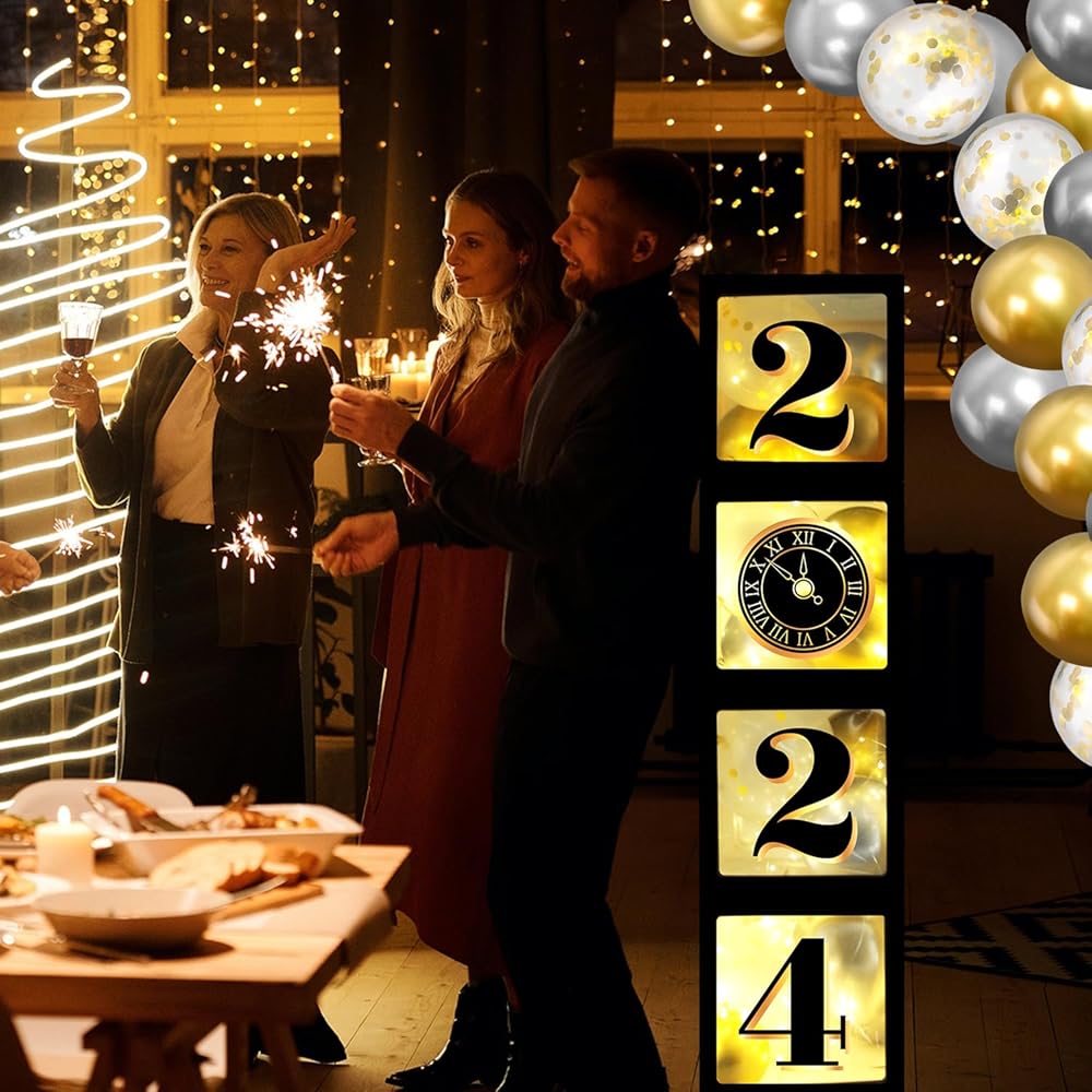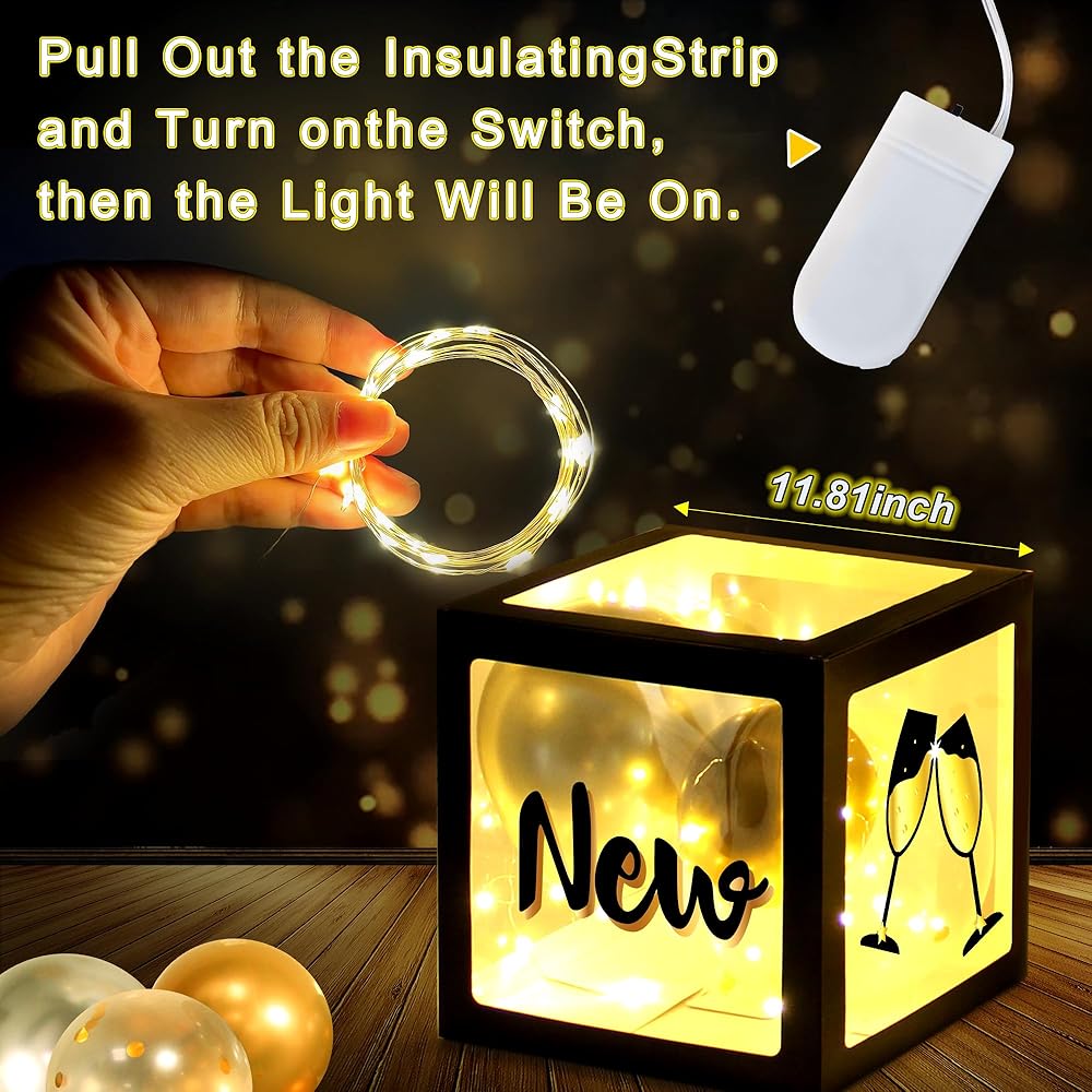 اوكي صناديق بالونات لحفلات ليلة رأس السنة الجديدة 2024 مع بالونات وخيوط اضاءة LED بلون اسود وذهبي لحفلات ليلة رأس السنة الجديدة لمستلزمات حفلات ليلة رأس السنة الجديدة 2023