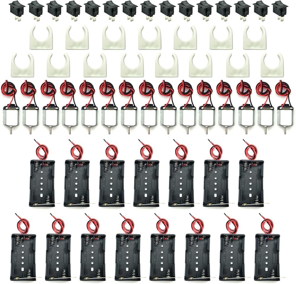محركات تيار مستمر - 3.0 فولت 24000 دورة في الدقيقة، خمسة محركات وحافظة حامل بطاريات وخمسة حوامل تثبيت للمحركات في كل عبوة. يمكن أن تعمل مع العديد من مصادر الطاقة - البطاريات والخلايا الشمسية تعمل بشكل مثالي. محرك ممتع رائع، مثالي للمروحة الصغيرة والألعاب الكهربائية والتجارب العلمية وما إلى ذلك. للأعمار من 6 سنوات فما فوق.