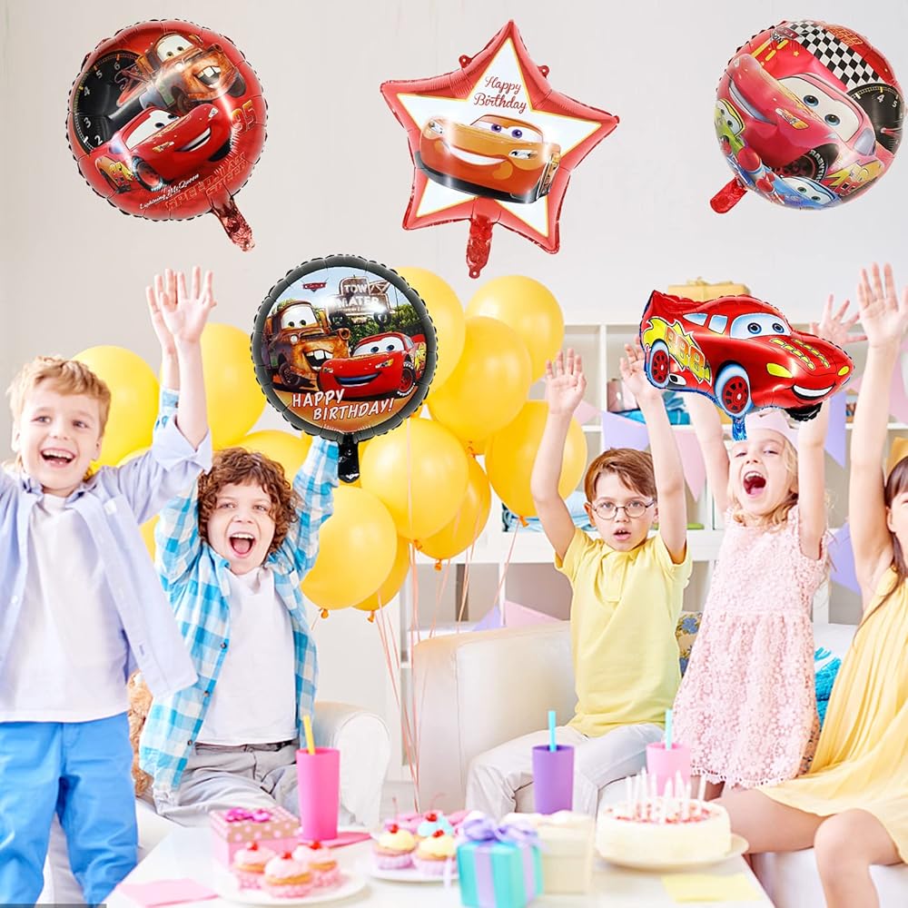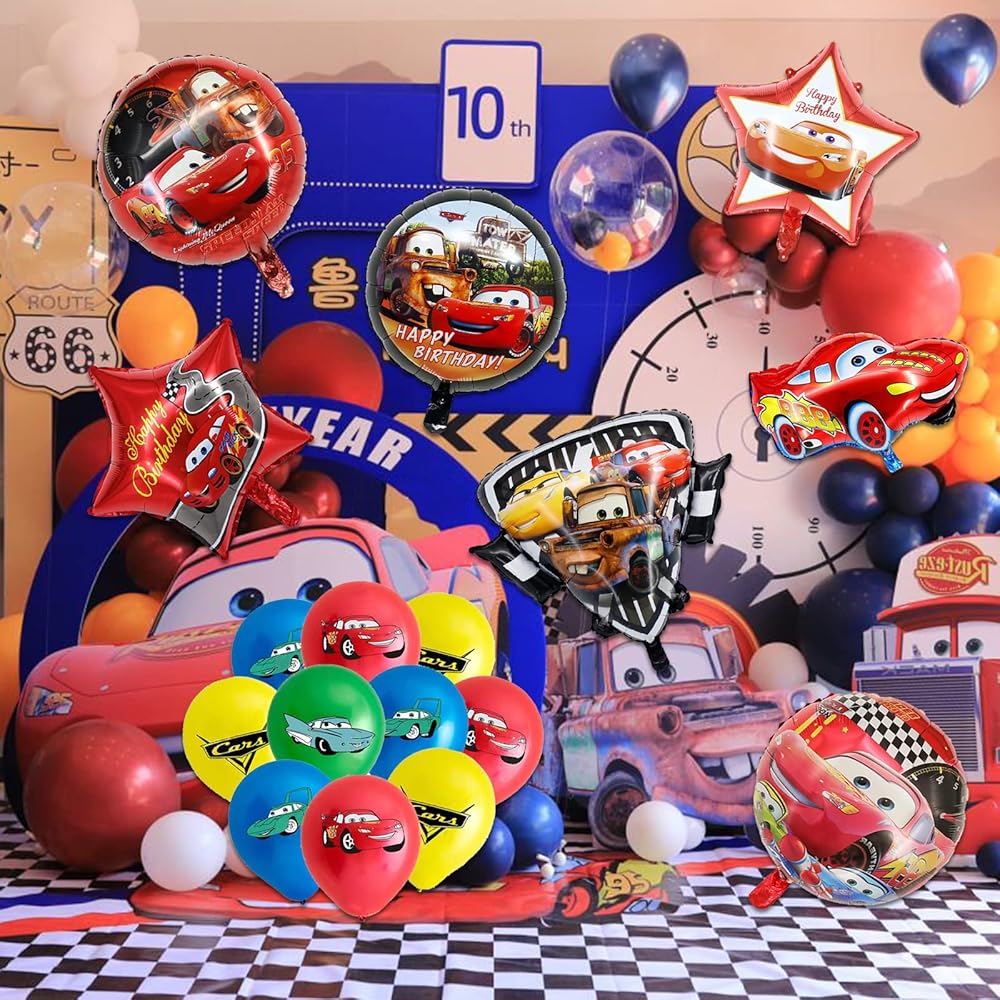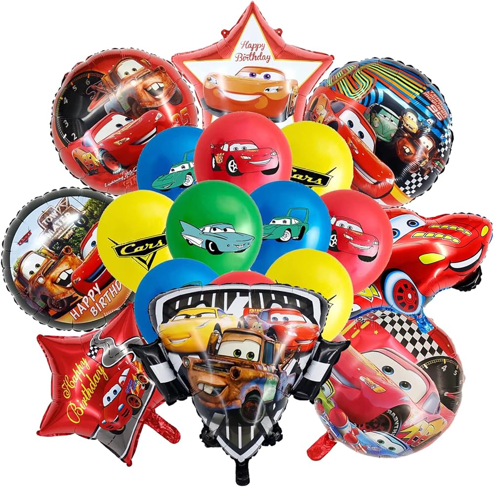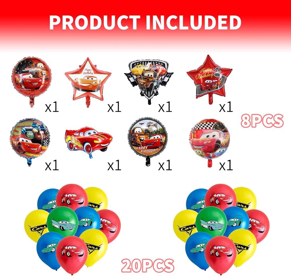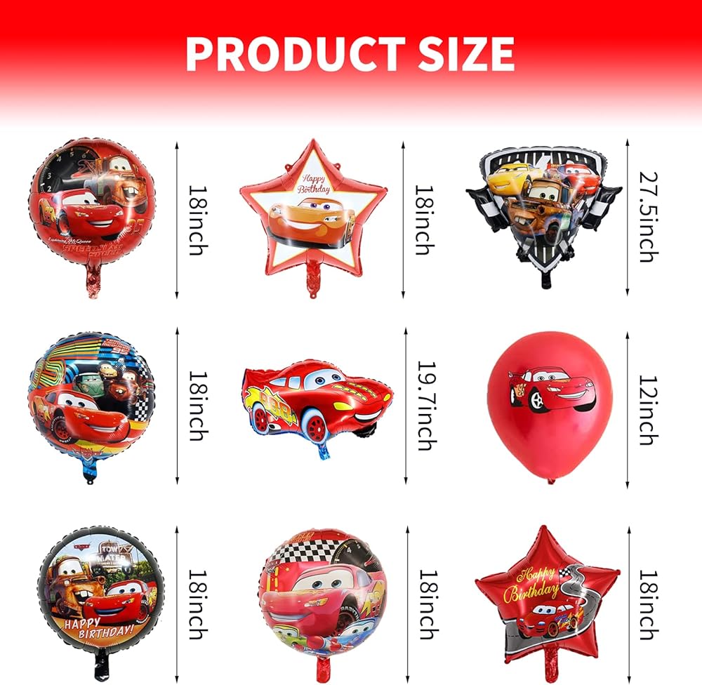 • ·Value Pack: Cars birthday Party Supplies Set includes 20pcs 12" Latex Balloons (Green 5/Yellow 5/Red 5/Blue 5 ), 2pcs 18inch happy birthday pentagrams;4pcs 18inch McQueen Cars Balloons and 2pcs Giant Size Cars Lightning McQueen Foil Balloons.They can provide more options for party decoration.