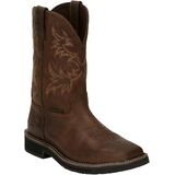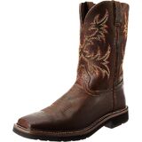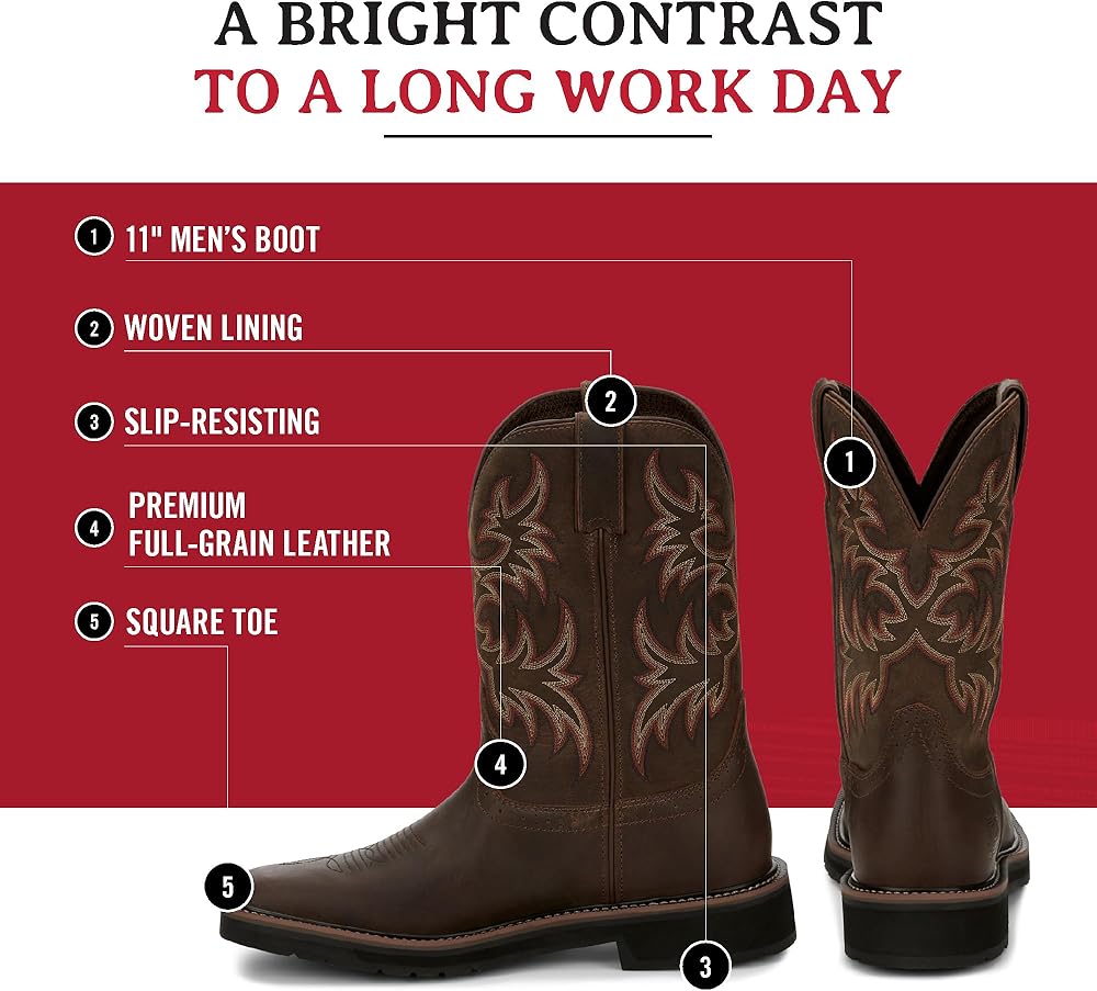 . Full-grain leather. 11" shaft. Wide square soft toe. Mesh lining. J-flex cushion insole. ASTM F2413 electrical hazard protection. Rubber outsoleWestern heel