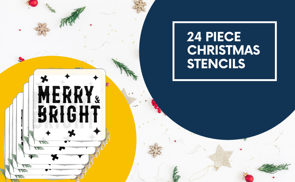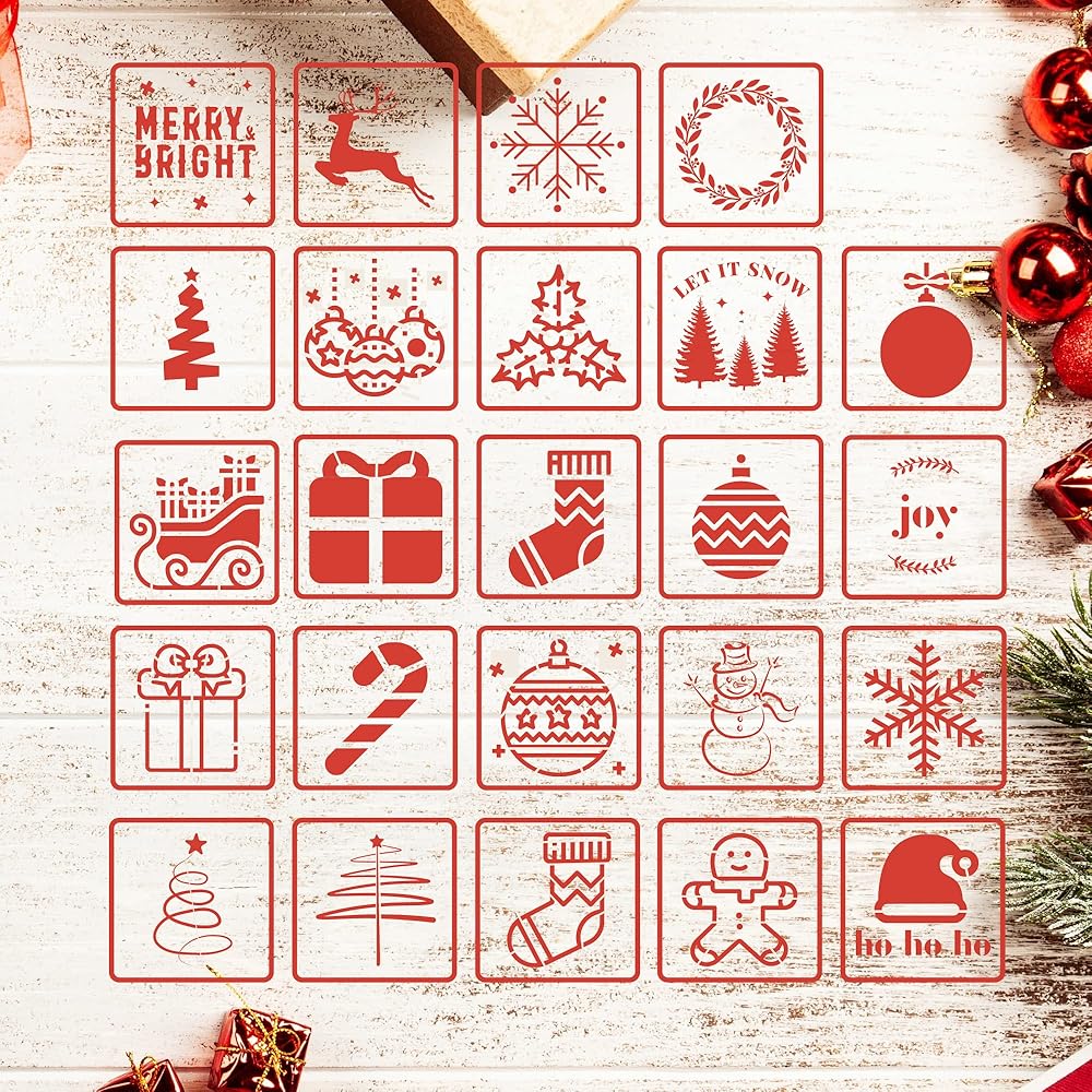 استنسل صغير للكريسماس - 3 × 3 انش | استنسل الكريسماس قابل لاعادة الاستخدام | مجموعة استنسل زينة للعطلات 24 قطعة